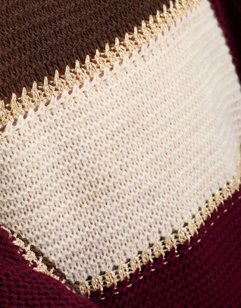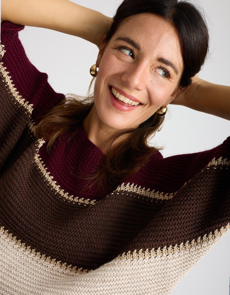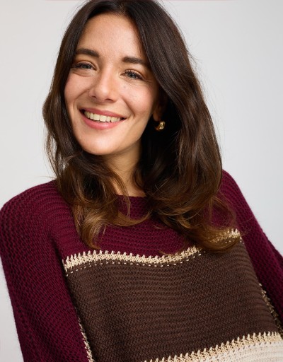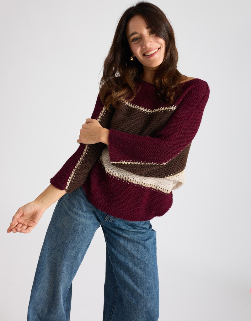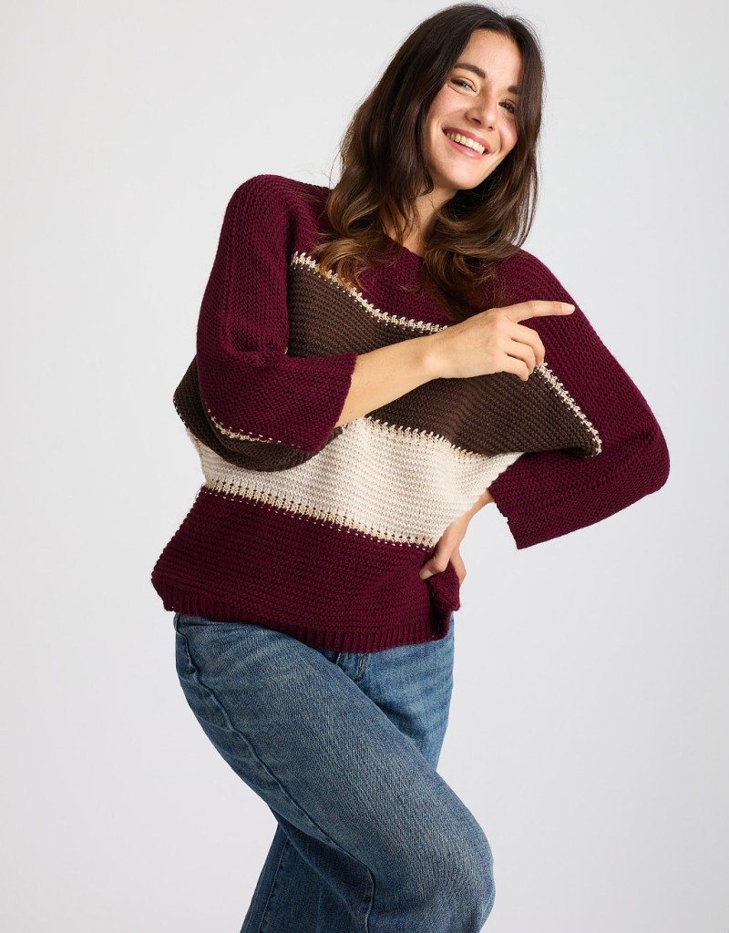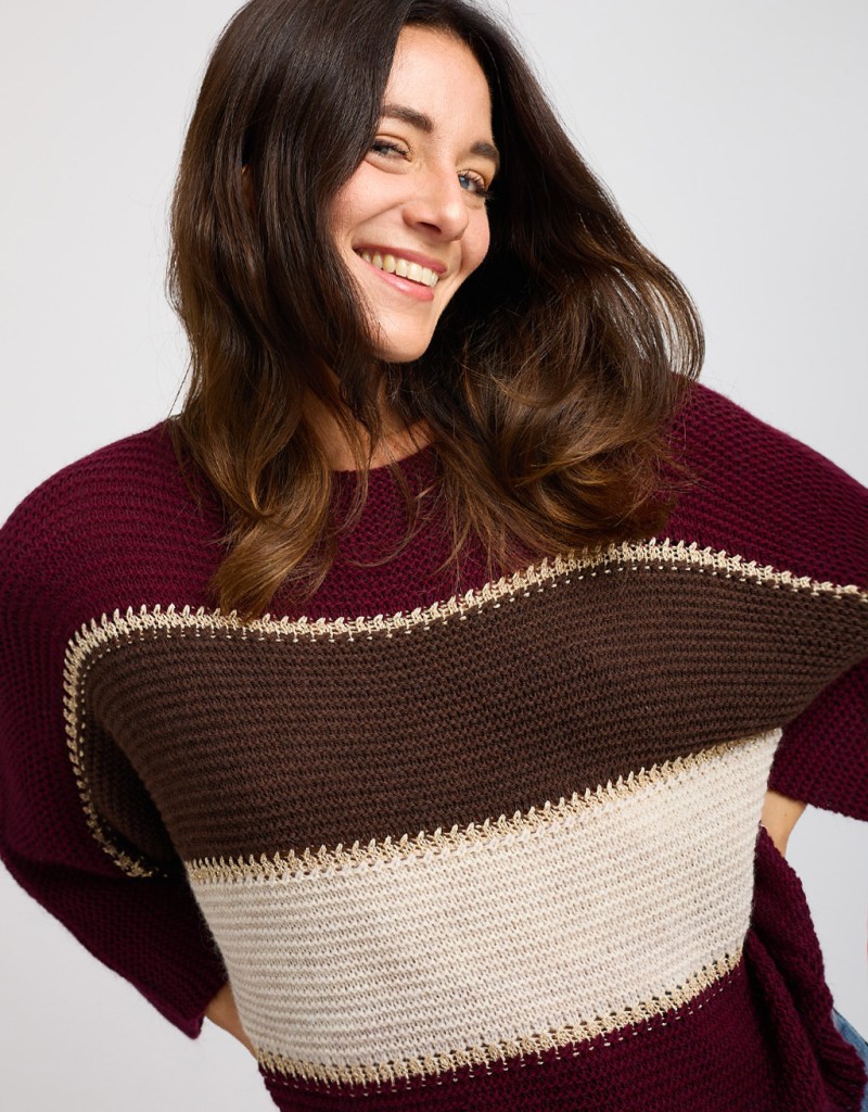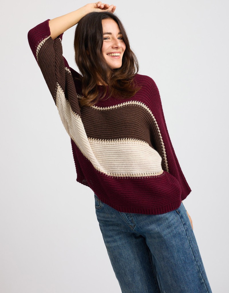 Maglione in morbido tessuto con fantasia a righe arricchita da fili lurex che donano una luminosità. La manica 3/4 a pipistrello e la vestibilità over assicurano comfort e libertà di movimento, rendendolo un capo casual ma ricercato. Perfetto per chi ama uno stile rilassato con un tocco di brillantezza.