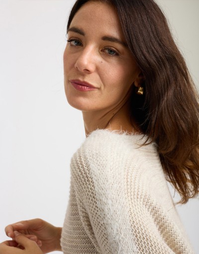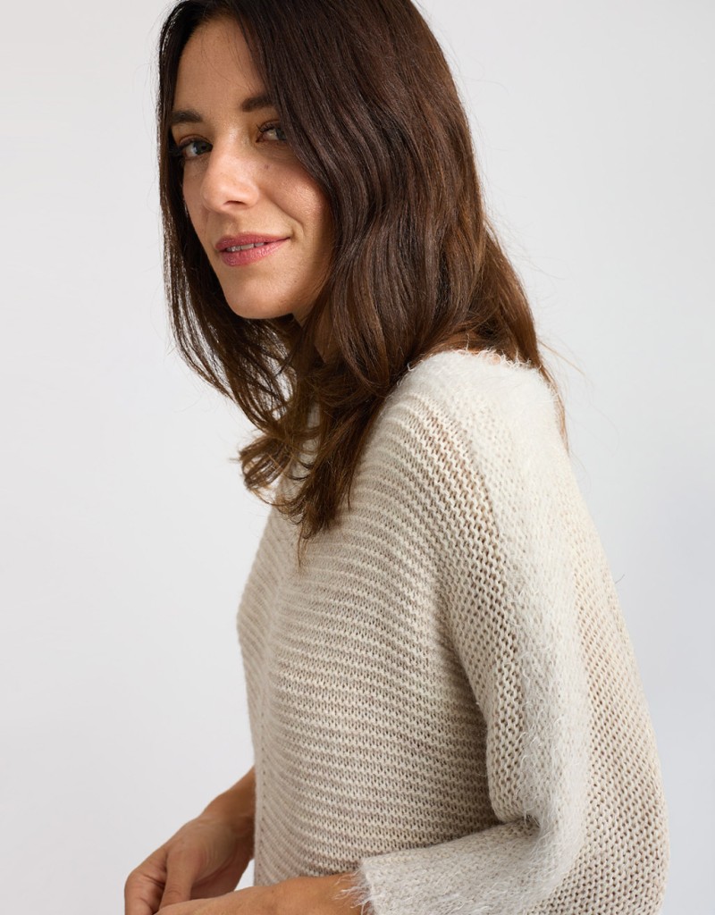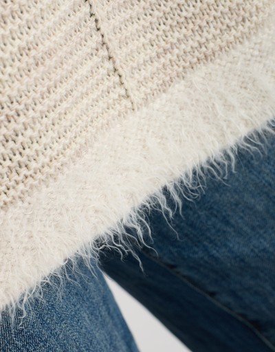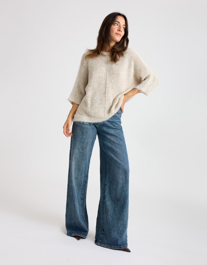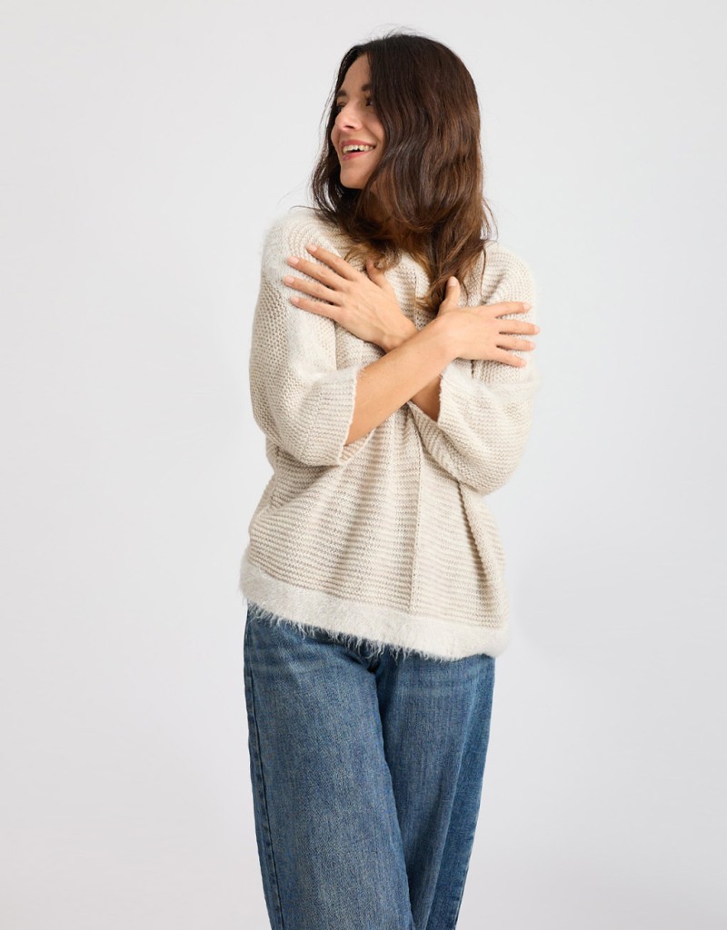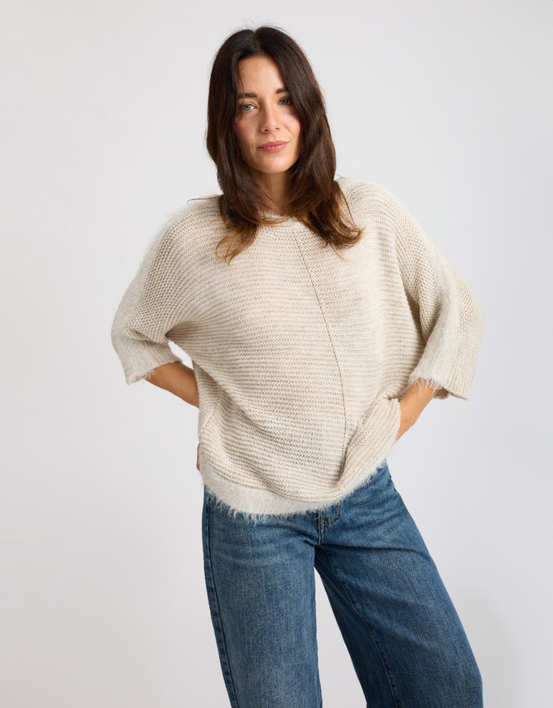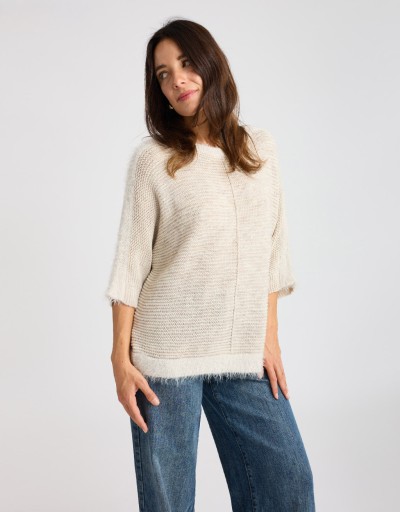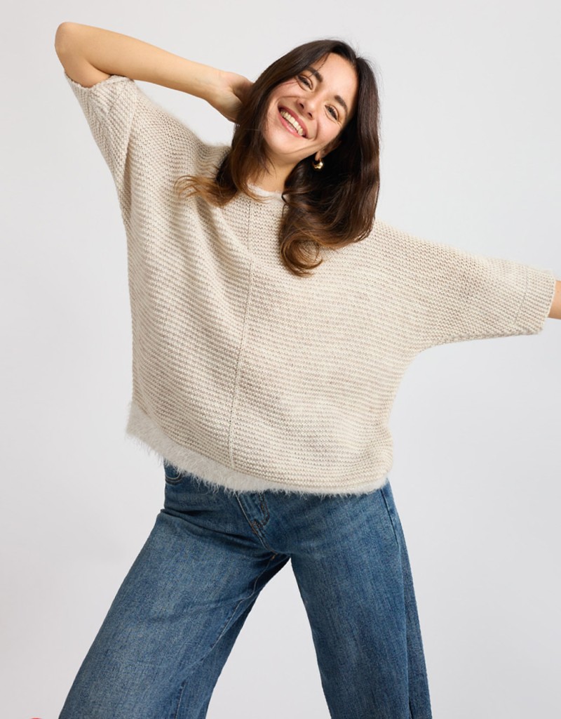 Maglione dal tessuto morbido e caldo, con manica 3/4 a pipistrello che dona un effetto fluido e rilassato. Le rifiniture ai bordi in tessuto più peloso aggiungono un tocco originale e soffice. La vestibilità over garantisce comfort e libertà di movimento, rendendolo perfetto per look casual e moderni.