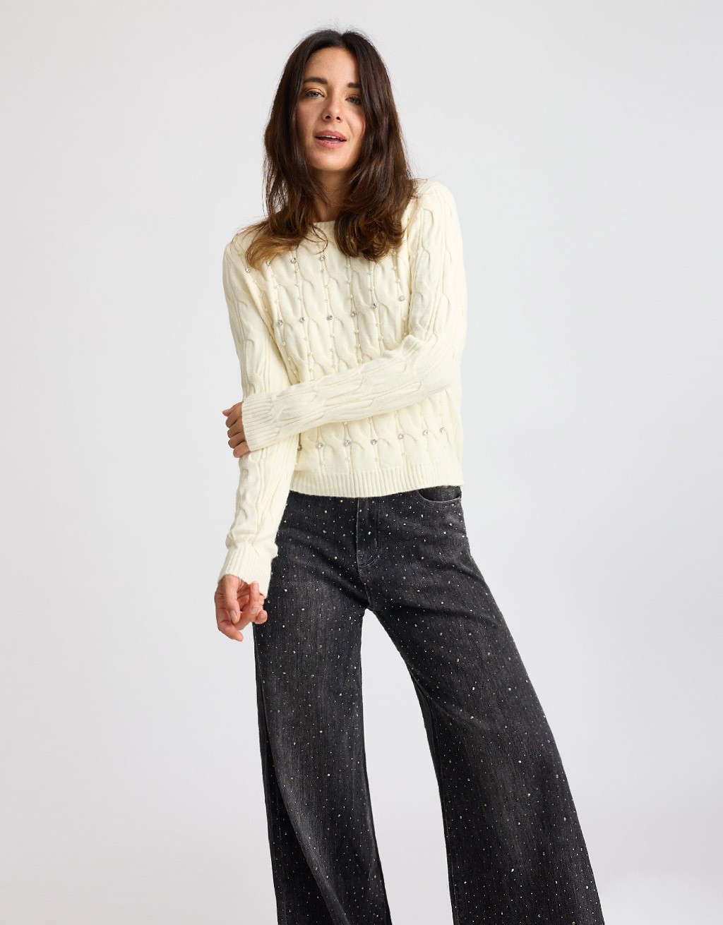 Maglione in morbido tessuto tinta unita con elegante lavorazione a treccia e raffinati dettagli di castoni e perle applicate sul davanti. La scollatura a giro e la vestibilità aderente valorizzano la figura, donando un tocco femminile e luminoso. Un capo perfetto per la stagione più fredda, ideale per chi ama unire comfort e stile.