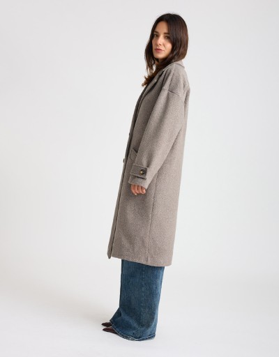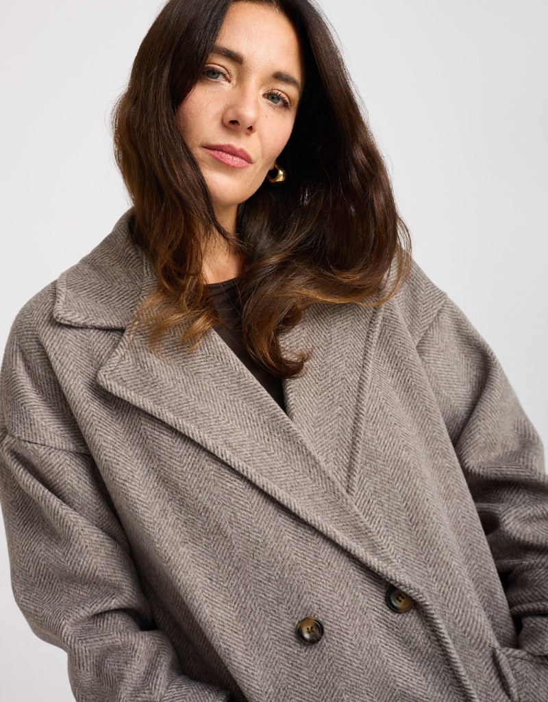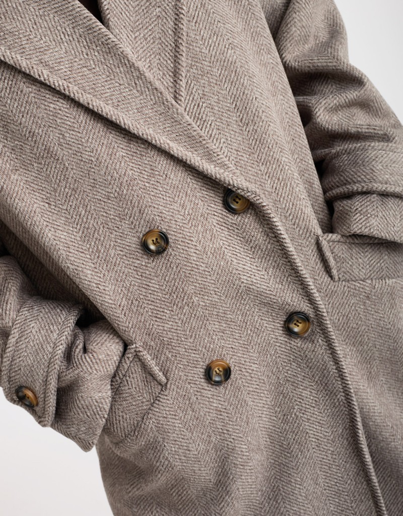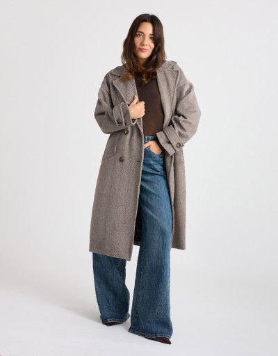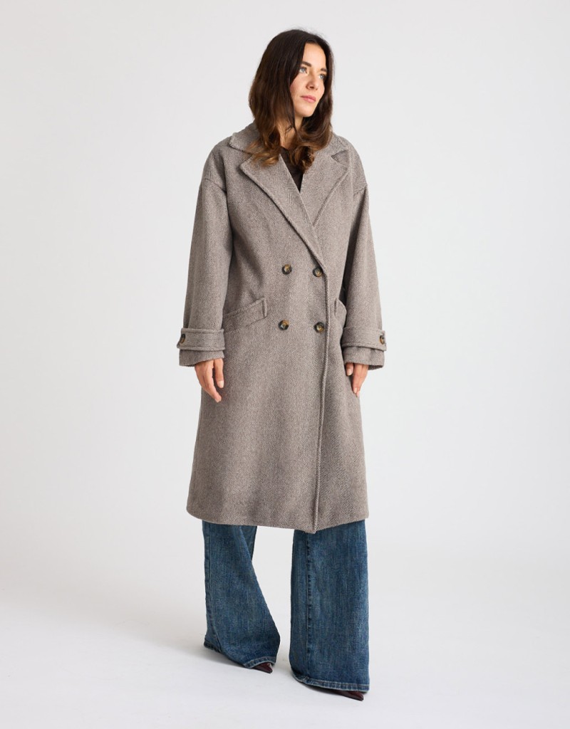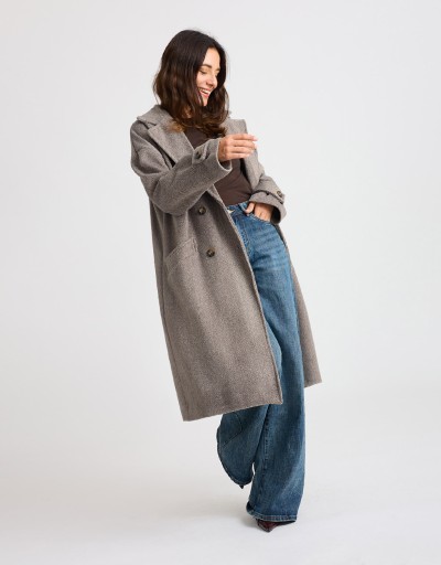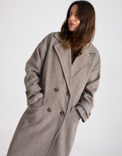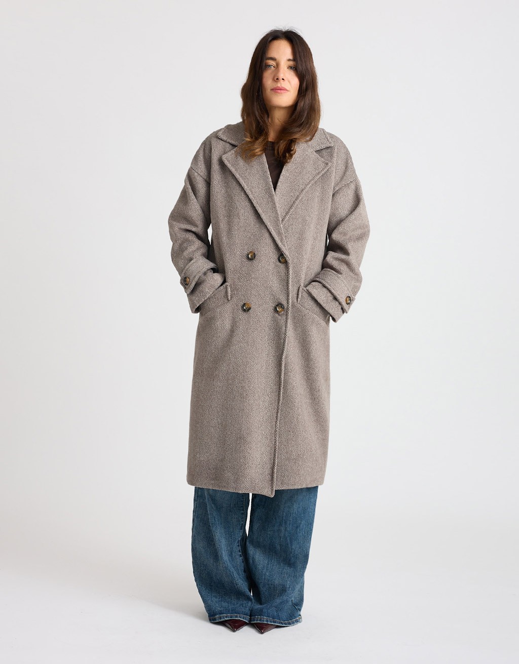 Cappotto lungo in panno con fantasia spinata, caratterizzato da un taglio over e leggermente informe che dona un effetto moderno e disinvolto. L’ampio collo a revers e la chiusura frontale a doppiopetto aggiungono un tocco classico e raffinato. Le tasche frontali e la fodera interna cucita garantiscono comfort e praticità, rendendolo ideale per affrontare la stagione fredda con stile.