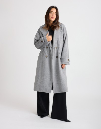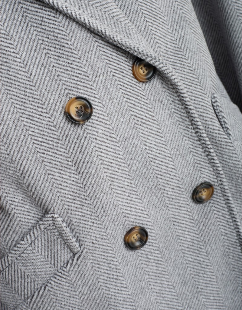 • Chiusura doppiopetto e collo a revers ampio