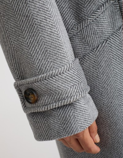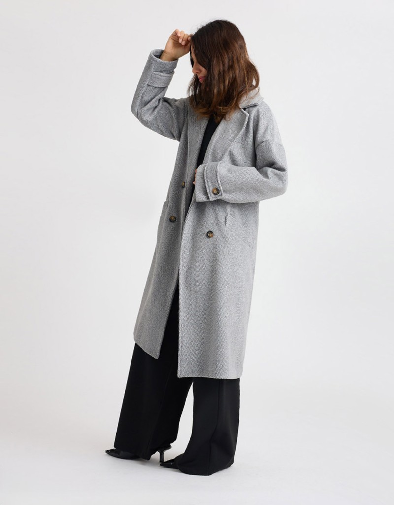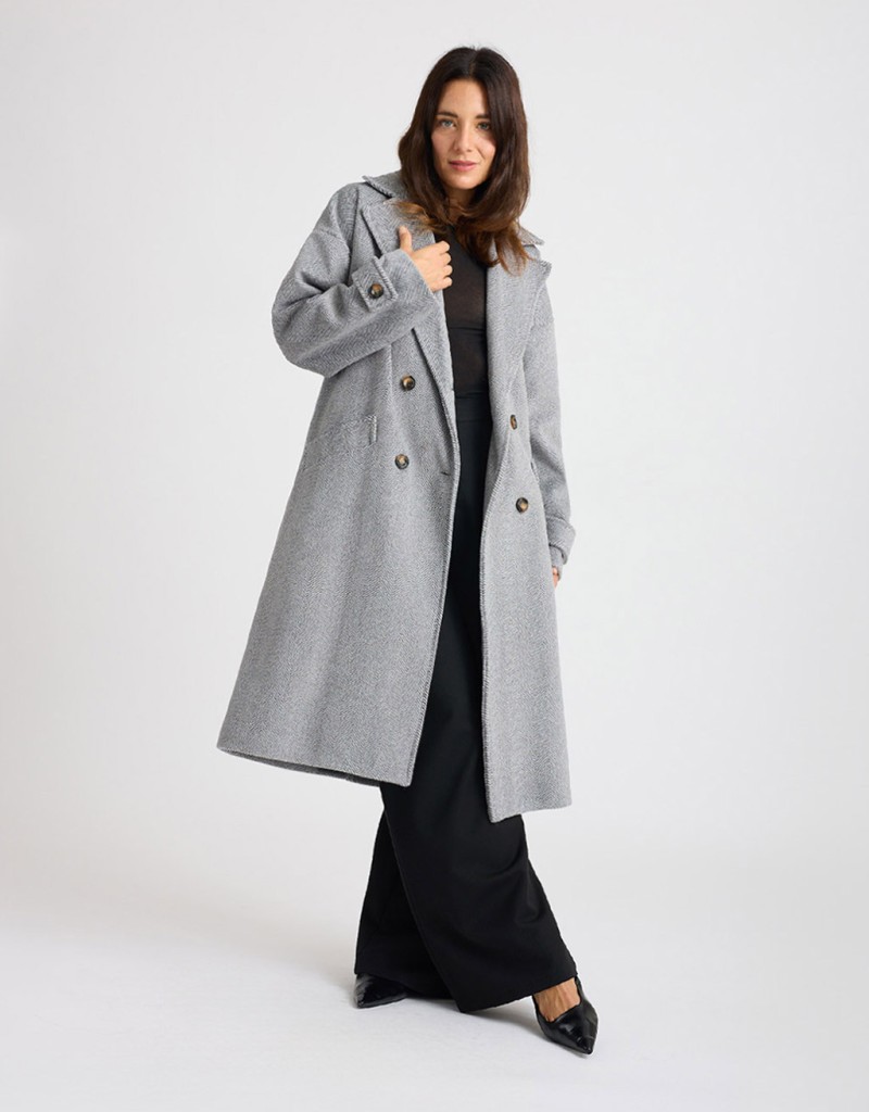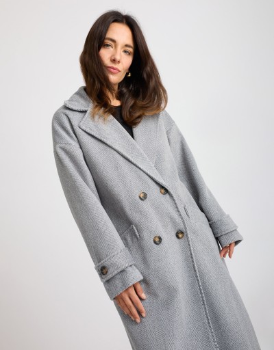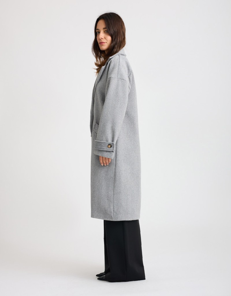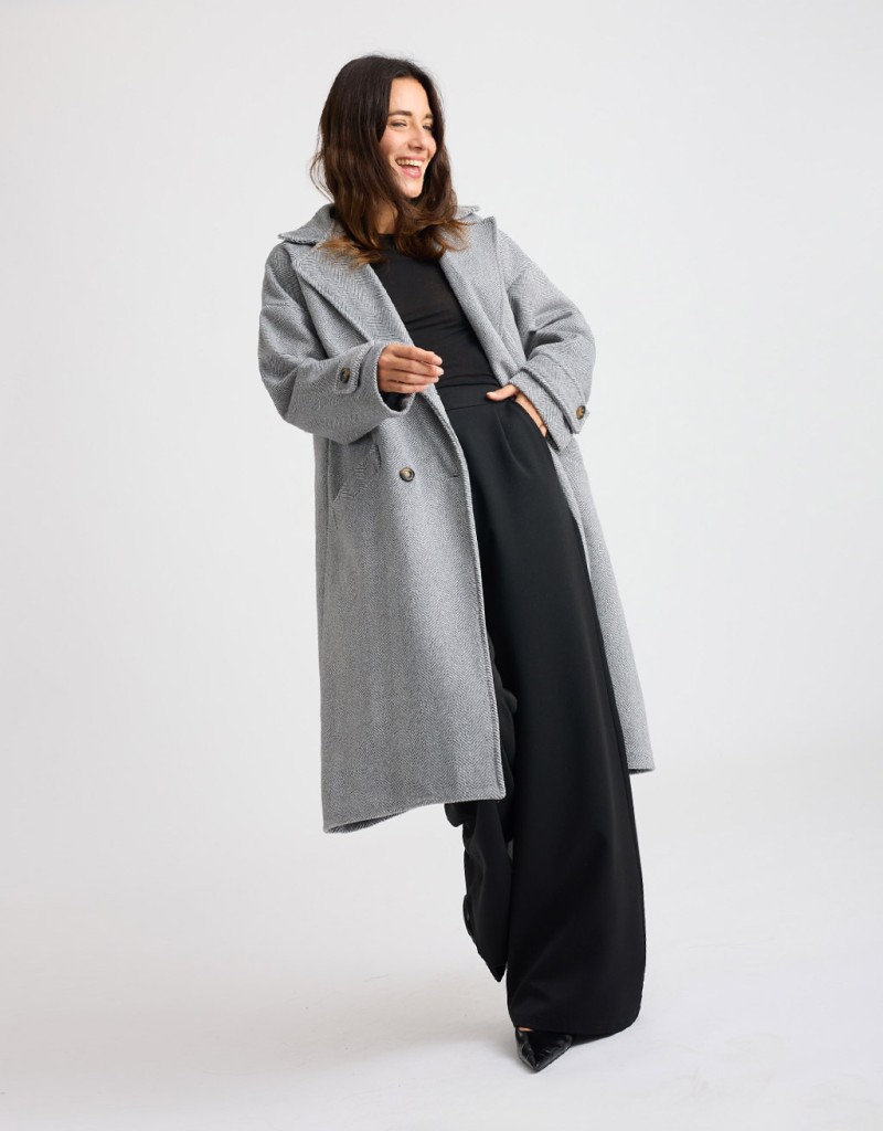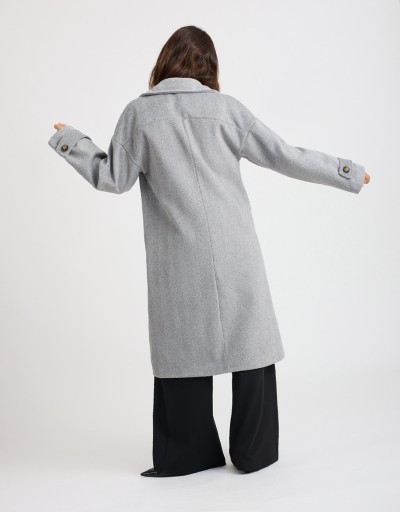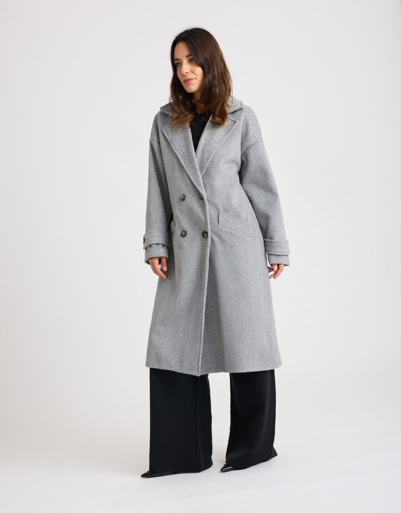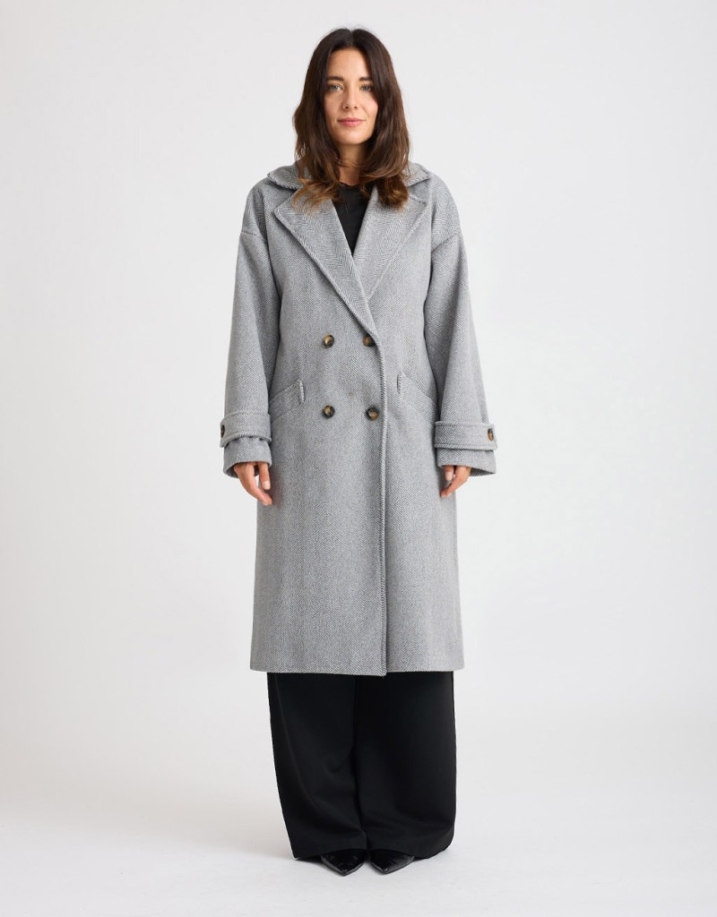 Cappotto lungo in panno con fantasia spinata, caratterizzato da un taglio over e leggermente informe che dona un effetto moderno e disinvolto. L’ampio collo a revers e la chiusura frontale a doppiopetto aggiungono un tocco classico e raffinato. Le tasche frontali e la fodera interna cucita garantiscono comfort e praticità, rendendolo ideale per affrontare la stagione fredda con stile.