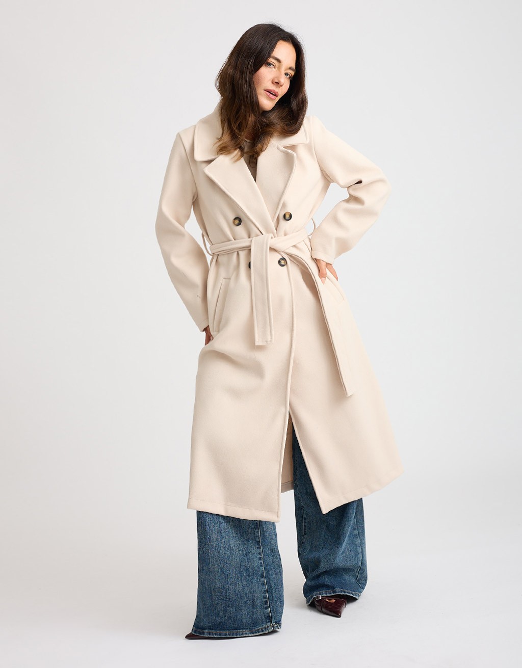 Cappotto lungo in panno dal taglio elegante e femminile, con ampio collo a revers e chiusura frontale doppiopetto. La fusciacca legata in vita consente di regolare la vestibilità e valorizza la silhouette, mentre le tasche frontali a filetto completano il design con un tocco raffinato. Un capo caldo e intramontabile, perfetto per la stagione fredda.