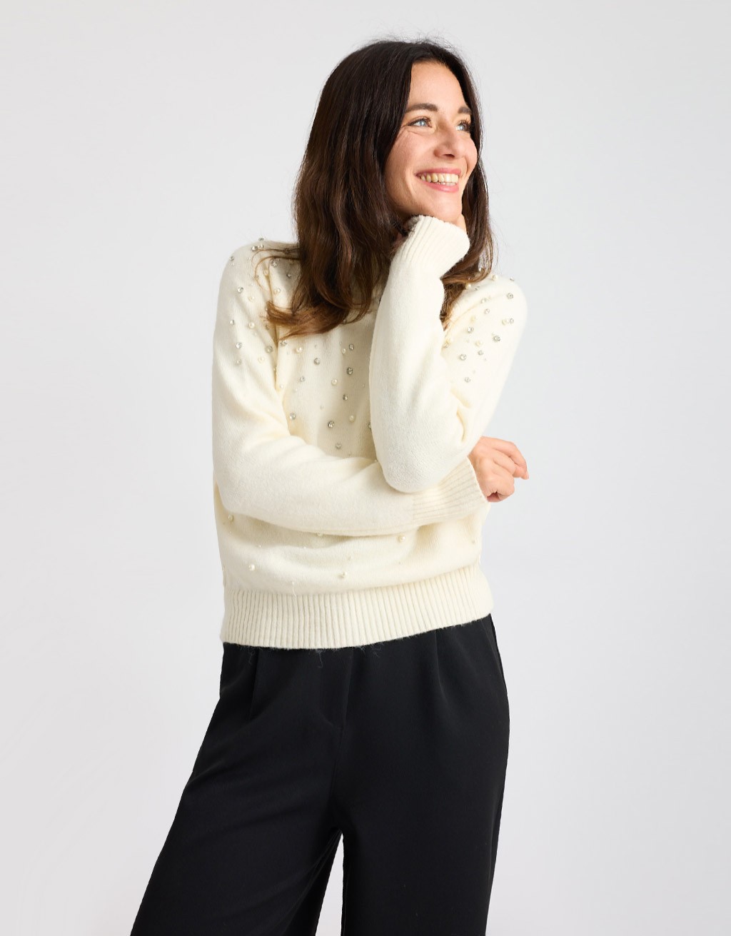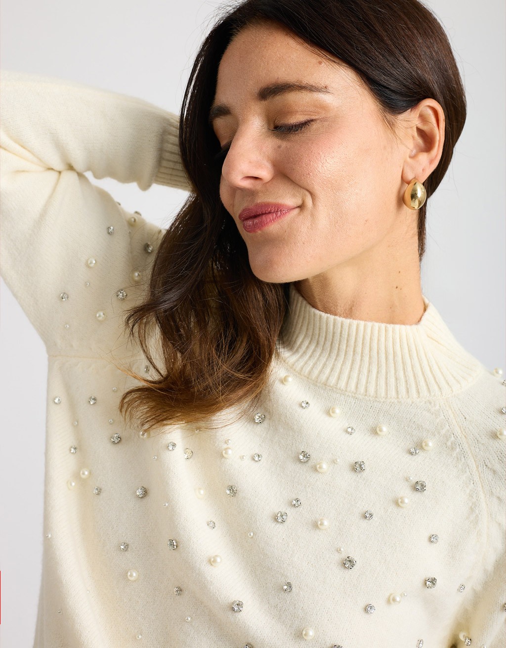 Maglione in tinta unita realizzato in un tessuto morbido e caldo, perfetto per la stagione fredda. Il collo a vulcano dona un tocco elegante e avvolgente, mentre il dettaglio di perle e strass applicate sulla parte frontale illumina il capo con discreta raffinatezza. Un modello femminile e confortevole, ideale per look curati e versatili.