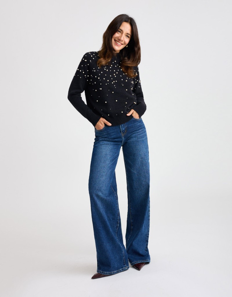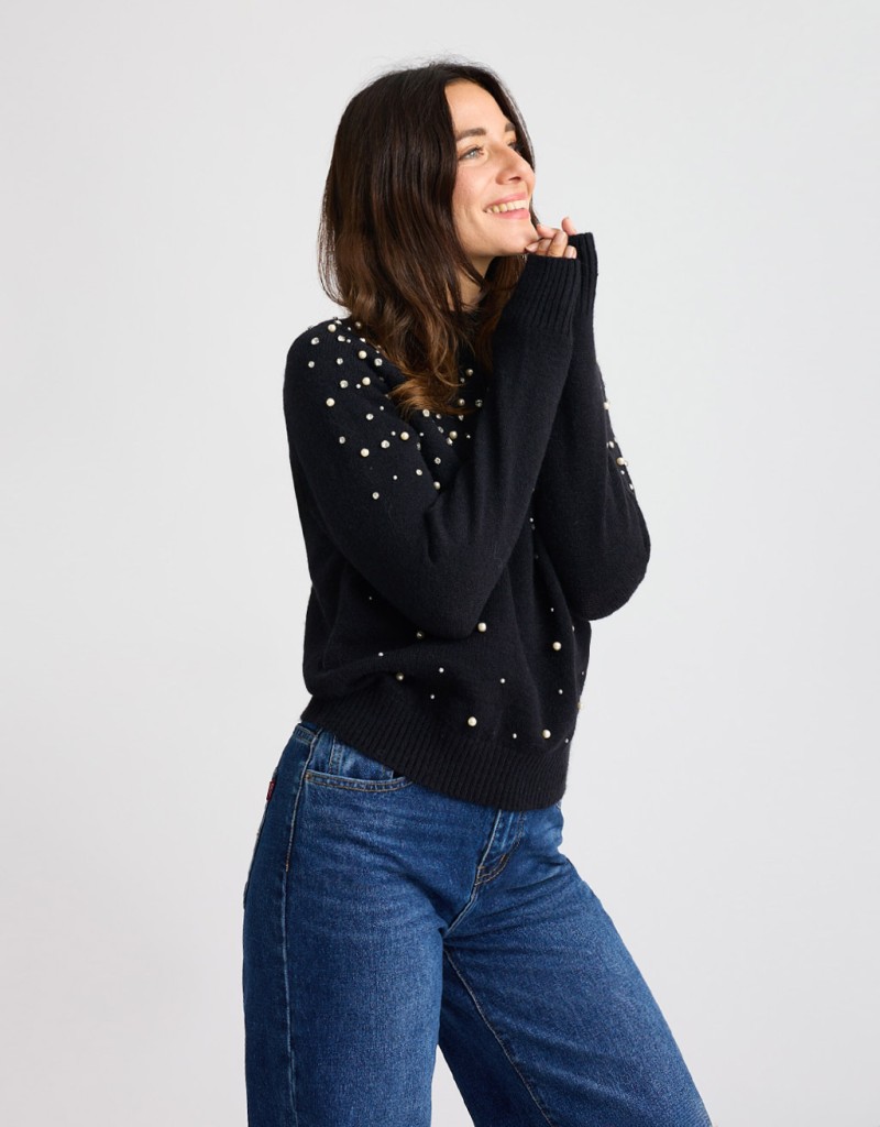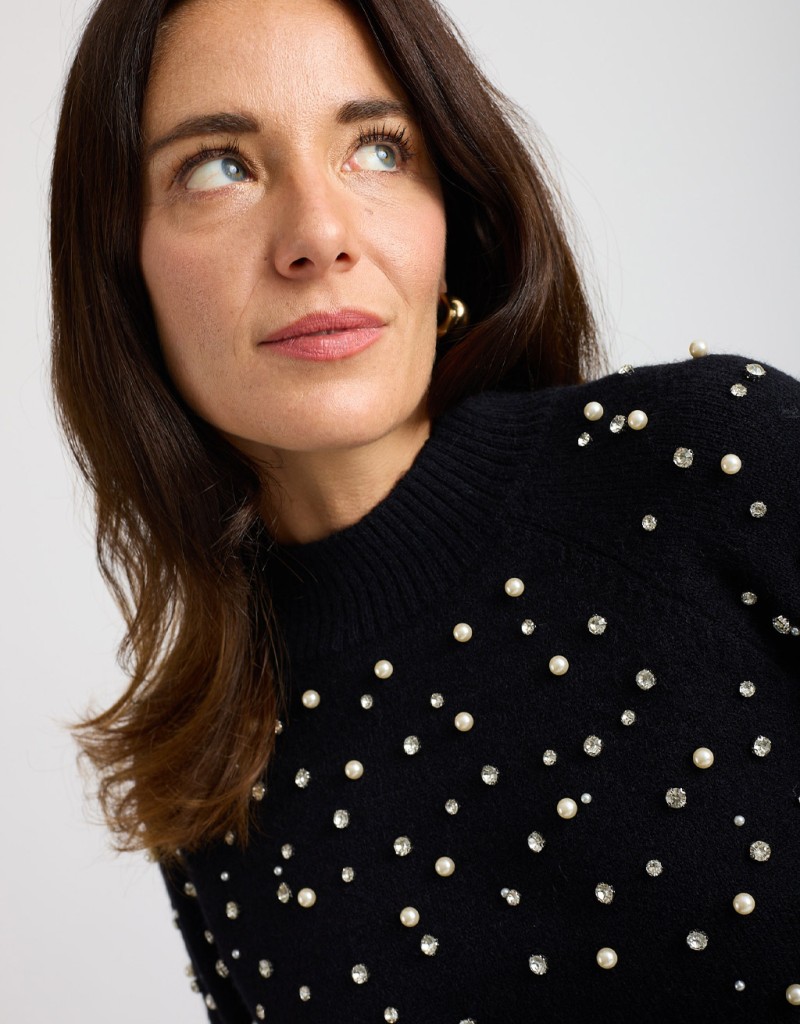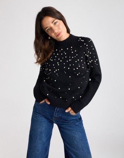Maglione in tinta unita realizzato in un tessuto morbido e caldo, perfetto per la stagione fredda. Il collo a vulcano dona un tocco elegante e avvolgente, mentre il dettaglio di perle e strass applicate sulla parte frontale illumina il capo con discreta raffinatezza. Un modello femminile e confortevole, ideale per look curati e versatili.