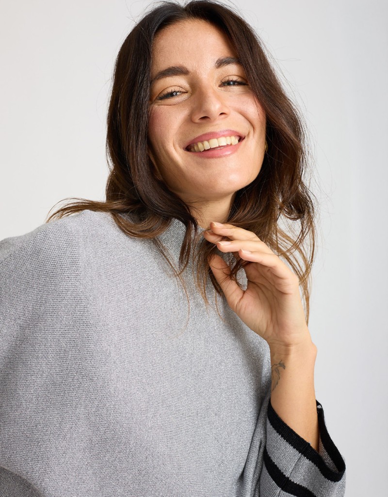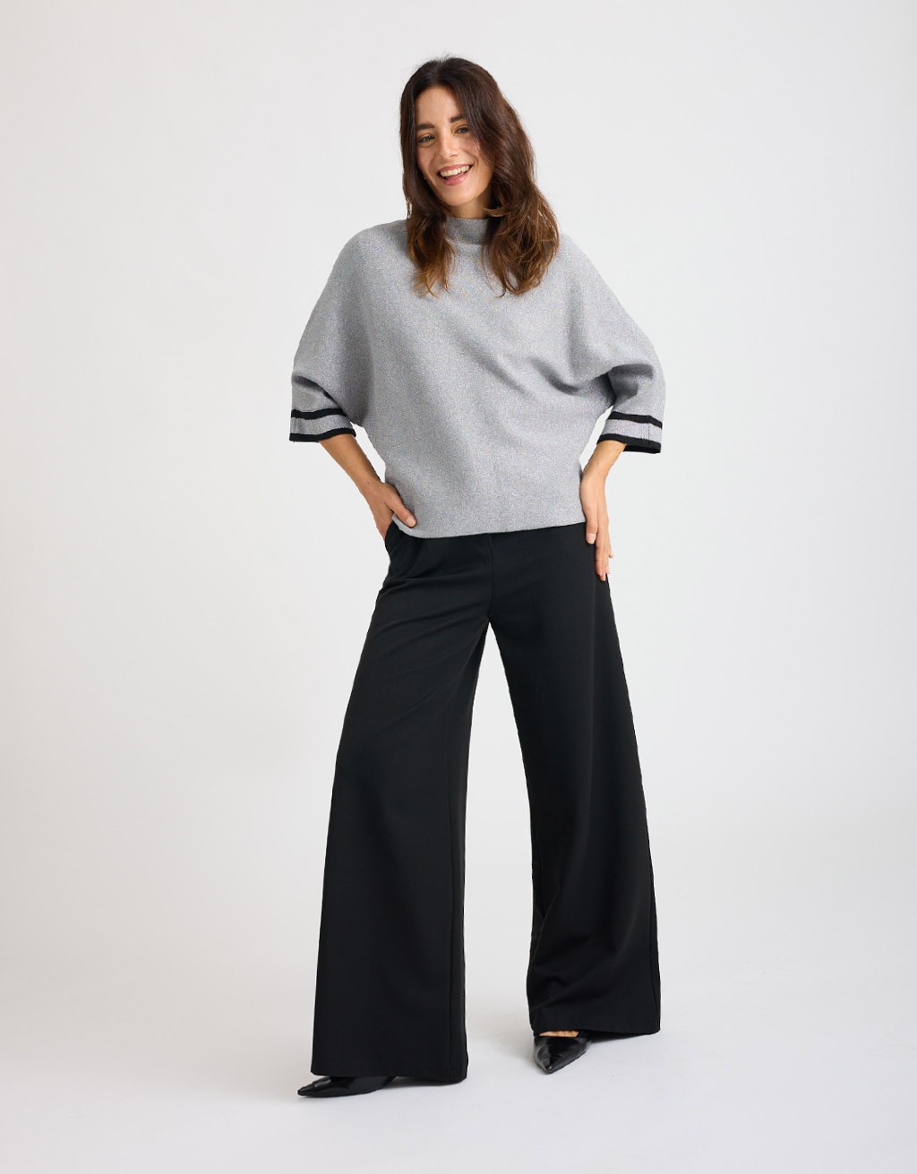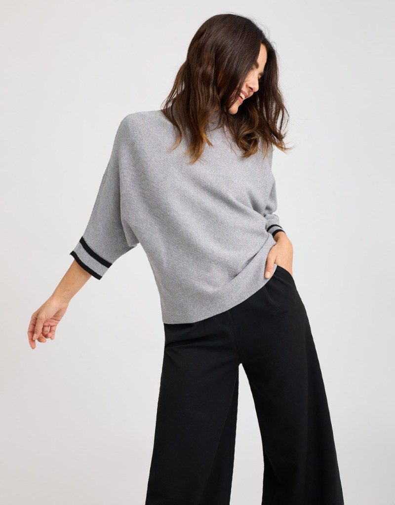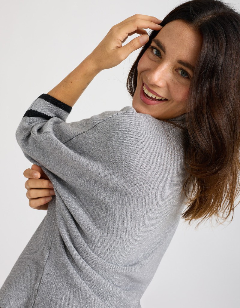 Un maglione che unisce comfort e brillantezza in perfetto stile Flare. Realizzato in morbido tessuto tinta unita con fili di lurex, regala un tocco luminoso e sofisticato senza rinunciare alla comodità. Il collo a lupetto e la manica a pipistrello donano una linea morbida e moderna, mentre le righe a contrasto sul fondo manica aggiungono un dettaglio originale e fashion. Perfetto per le giornate autunnali con un pizzico di luce in più.