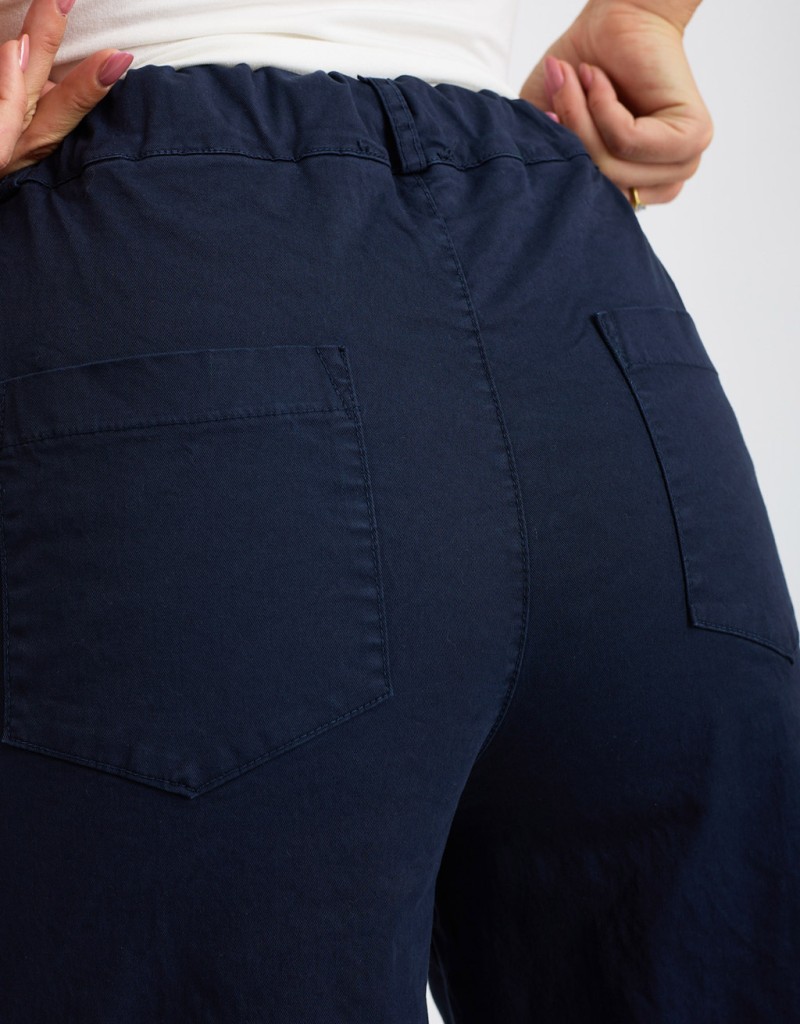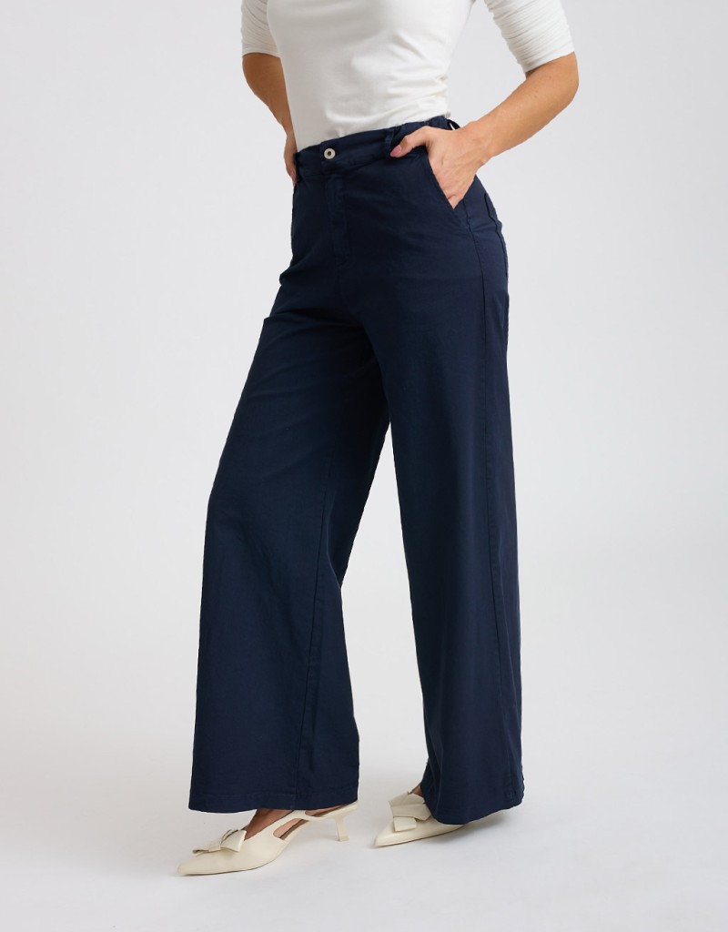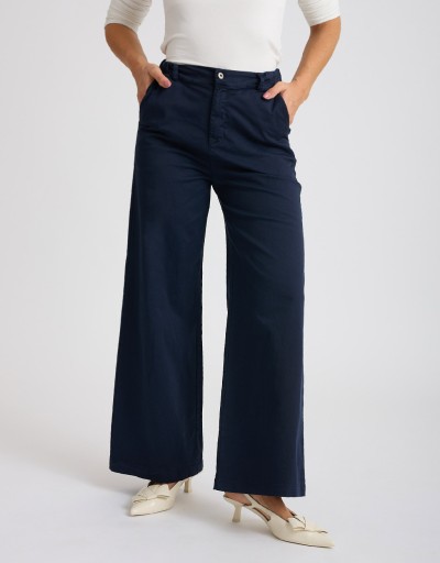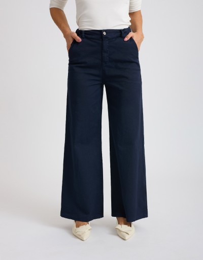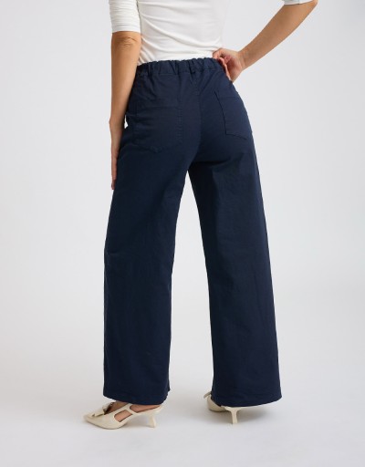 Pantalone in cotone a palazzo con elastico dietro in vita e chiusura frontale con bottone e cerniera.