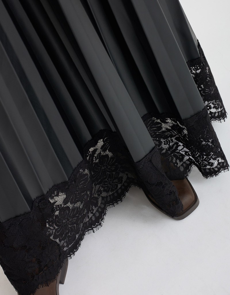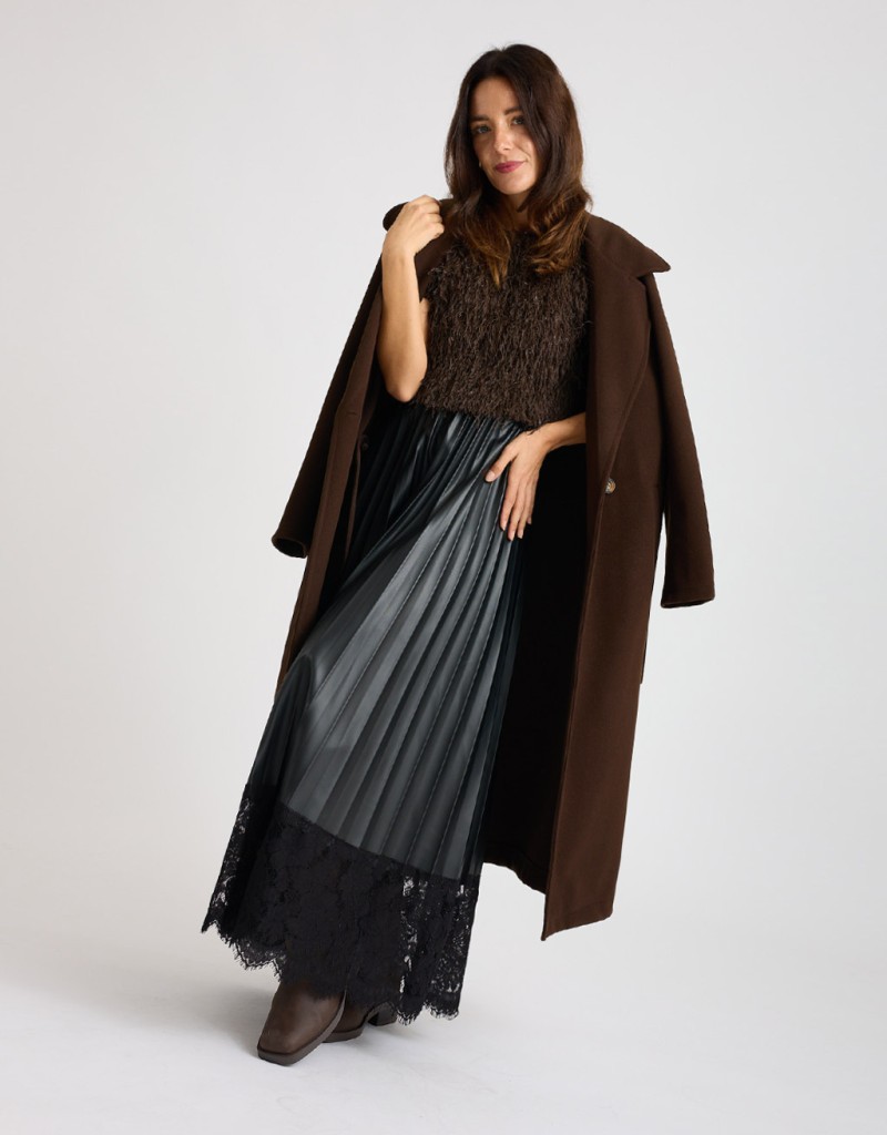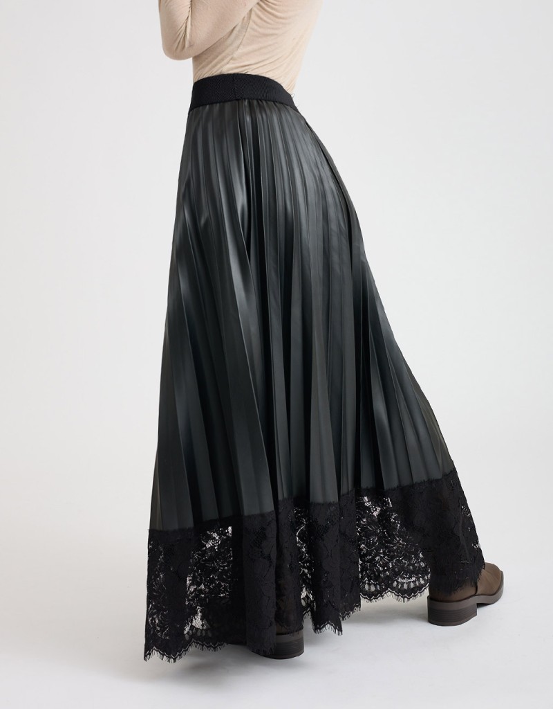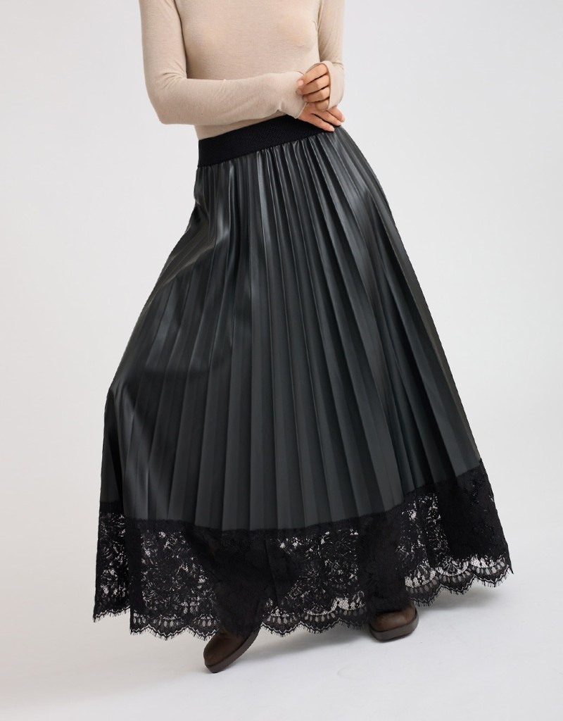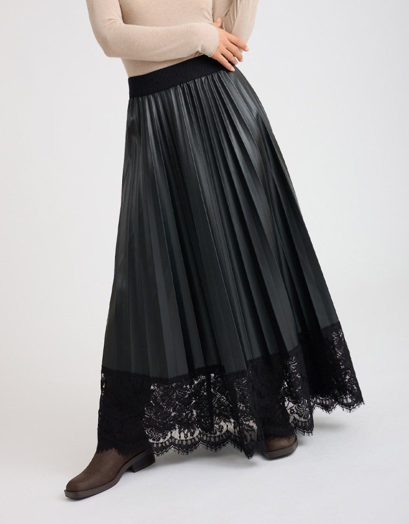 Una gonna lunga effetto pelle che unisce carattere e femminilità. Il tessuto plissettato crea un movimento elegante a ogni passo, mentre il bordo in pizzo aggiunge un tocco romantico e raffinato. La fascia elastica in vita garantisce comfort e una vestibilità perfetta. Un capo versatile che trasforma qualsiasi outfit in un look di tendenza.