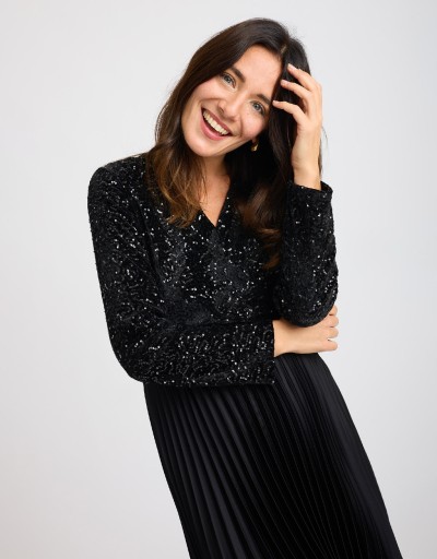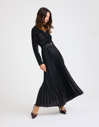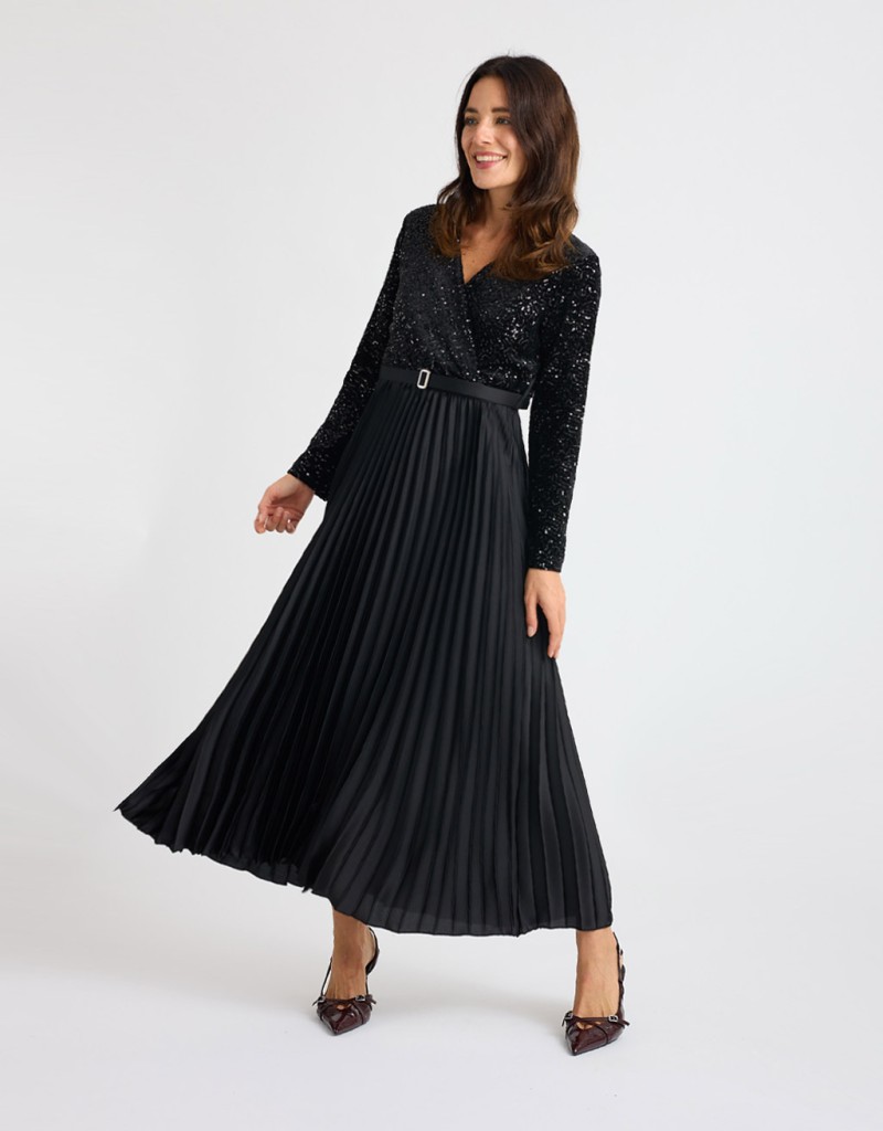 Abito lungo che unisce eleganza e luminosità in perfetto equilibrio. Il top floccato con paillettes cucite cattura la luce con raffinatezza, mentre la gonna in tessuto effetto raso plissettato dona movimento e leggerezza. La scollatura a incrocio valorizza il décolleté, mentre l’elastico e la cintura in vita definiscono la silhouette con naturalezza. La fodera interna nella parte superiore assicura comfort e vestibilità perfetta.