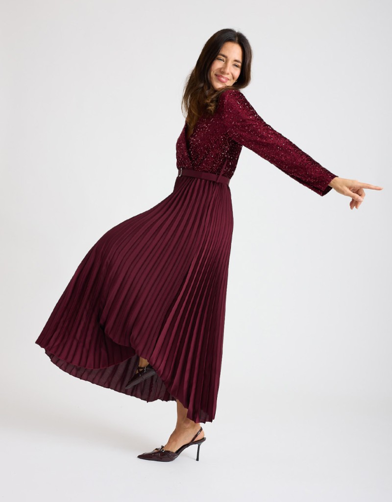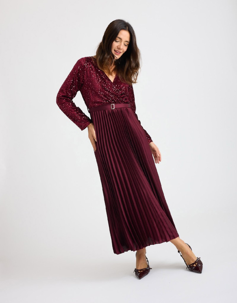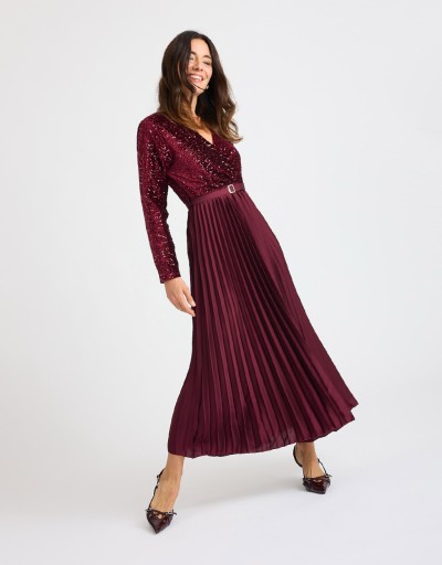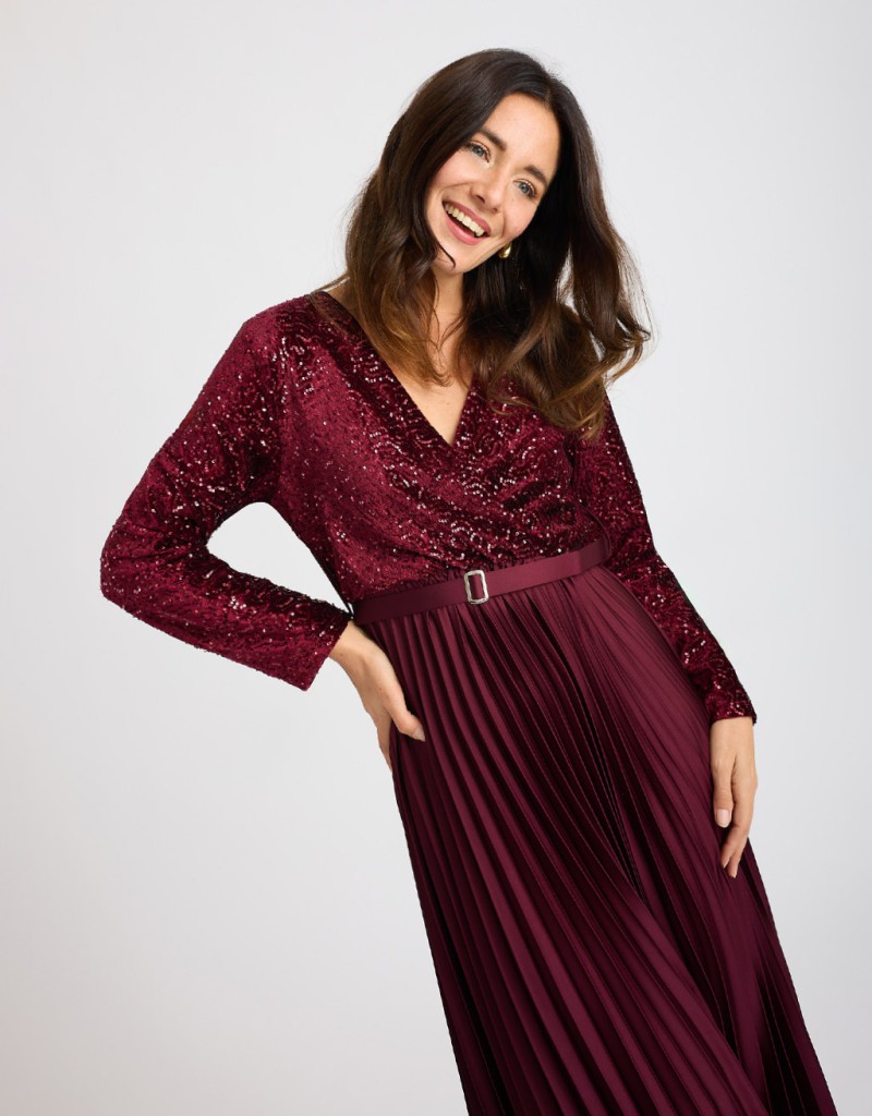 Abito lungo che unisce eleganza e luminosità in perfetto equilibrio. Il top floccato con paillettes cucite cattura la luce con raffinatezza, mentre la gonna in tessuto effetto raso plissettato dona movimento e leggerezza. La scollatura a incrocio valorizza il décolleté, mentre l’elastico e la cintura in vita definiscono la silhouette con naturalezza. La fodera interna nella parte superiore assicura comfort e vestibilità perfetta.