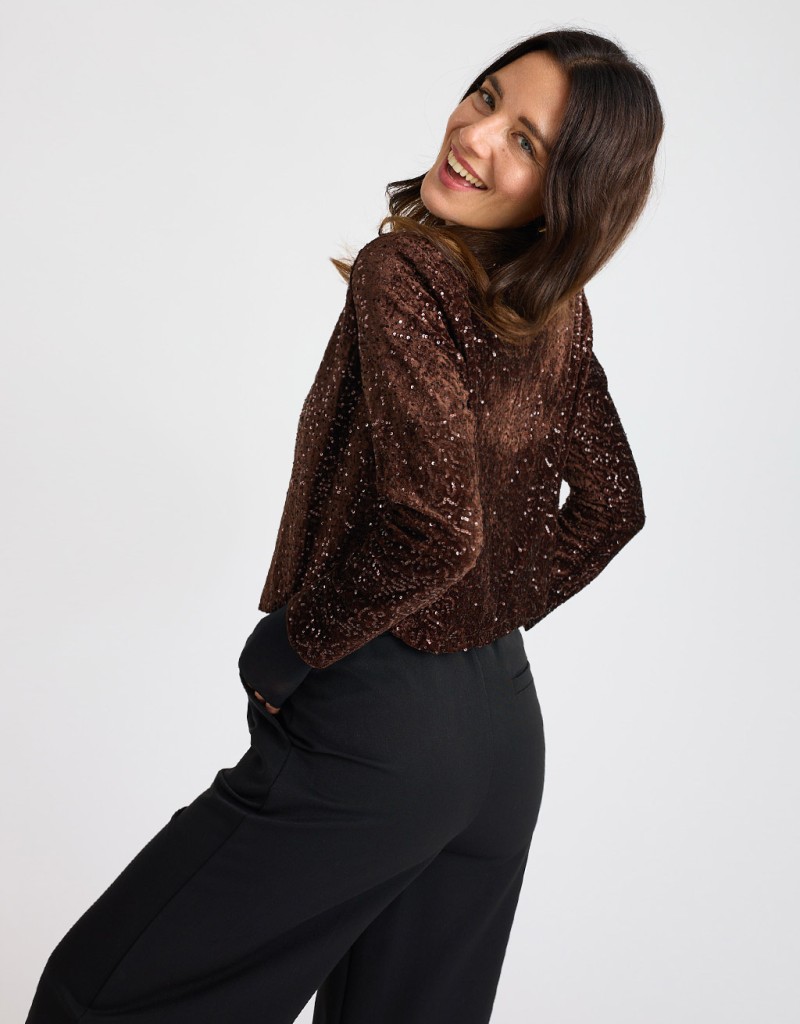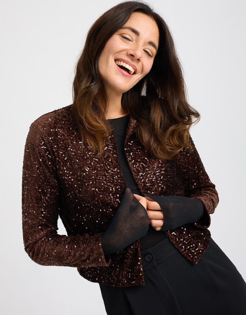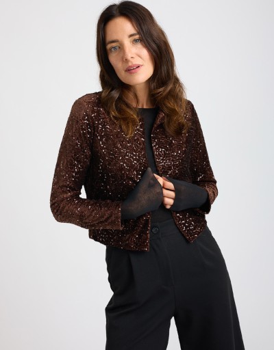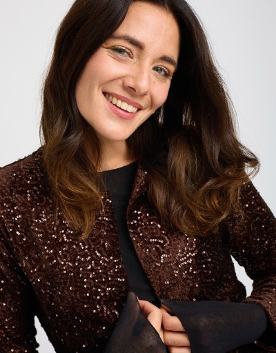 Brillante e sofisticato, questo giacchino corto floccato in paillettes cucite è il capo perfetto per dare luce a qualsiasi look. La scollatura a giro e la linea senza chiusura creano un effetto elegante e contemporaneo, mentre fodera e spalline interne garantiscono comfort e struttura. Ideale per completare un outfit da sera o per aggiungere un tocco glam a un look minimal. Può essere abbinato al Pantalone Floccato Paillettes cod. 30559