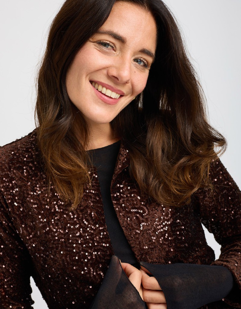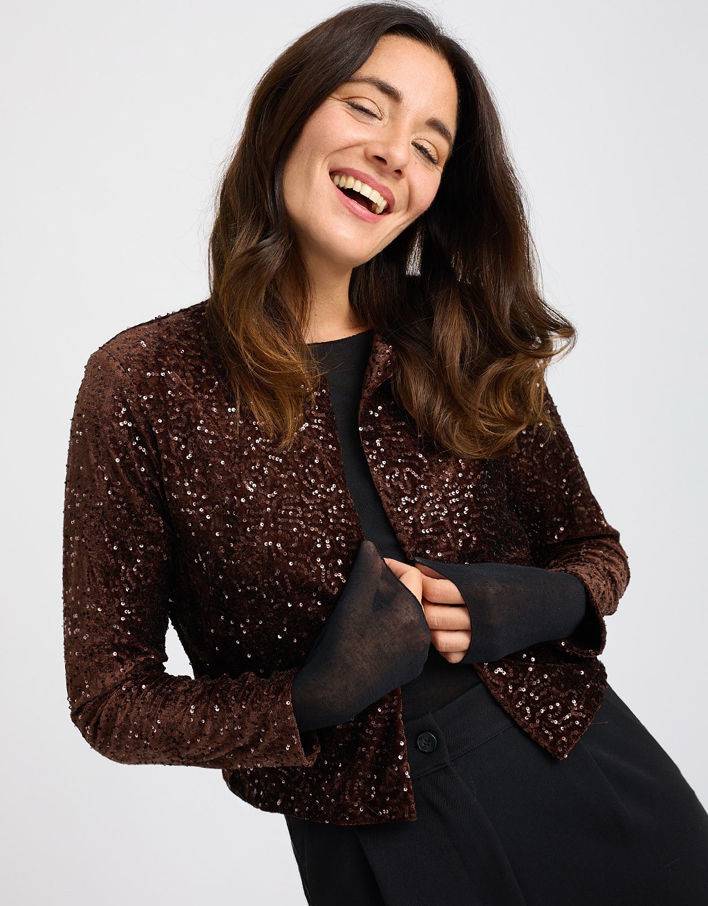 Indossalo sopra un top satinato e Pantalone Floccato Paillettes  per un total look scintillante da evento. Completa con tacchi e clutch essenziale.