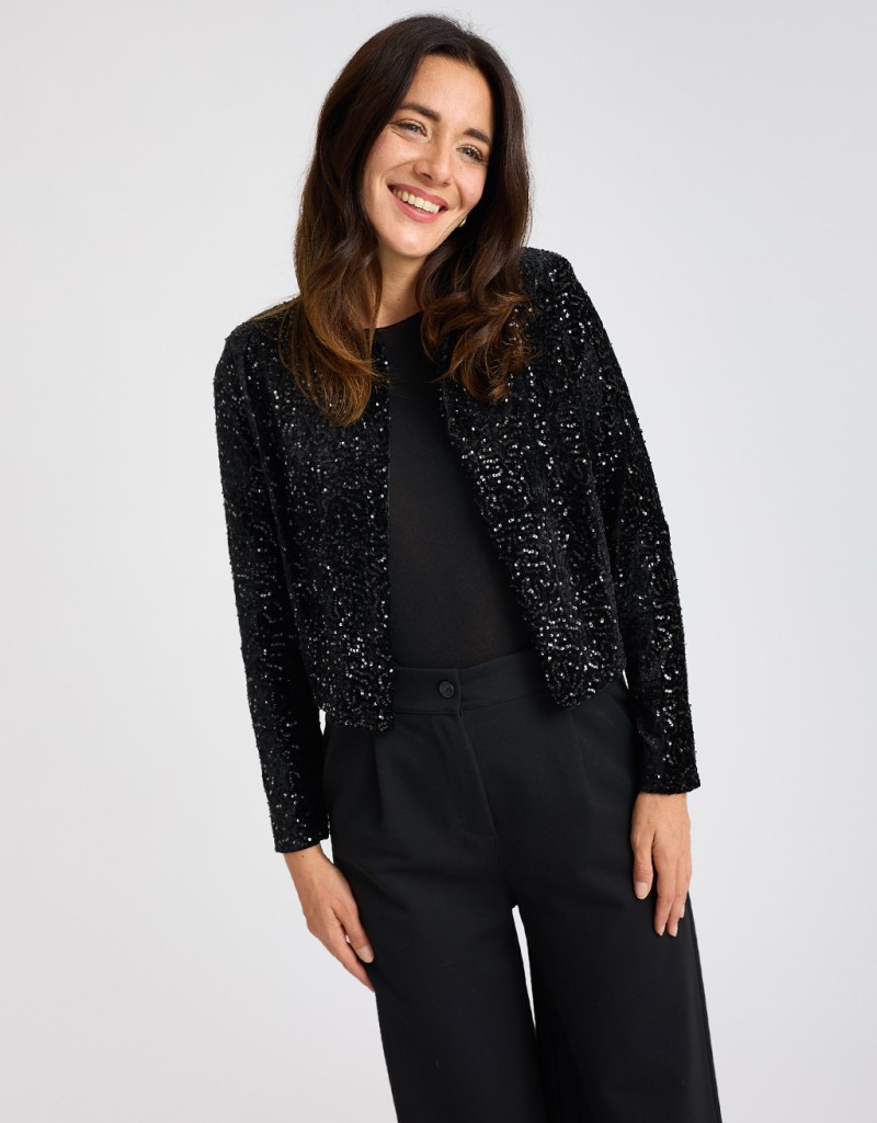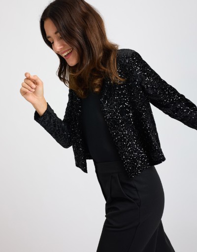 Brillante e sofisticato, questo giacchino corto floccato in paillettes cucite è il capo perfetto per dare luce a qualsiasi look. La scollatura a giro e la linea senza chiusura creano un effetto elegante e contemporaneo, mentre fodera e spalline interne garantiscono comfort e struttura. Ideale per completare un outfit da sera o per aggiungere un tocco glam a un look minimal. Può essere abbinato al Pantalone Floccato Paillettes cod. 30559