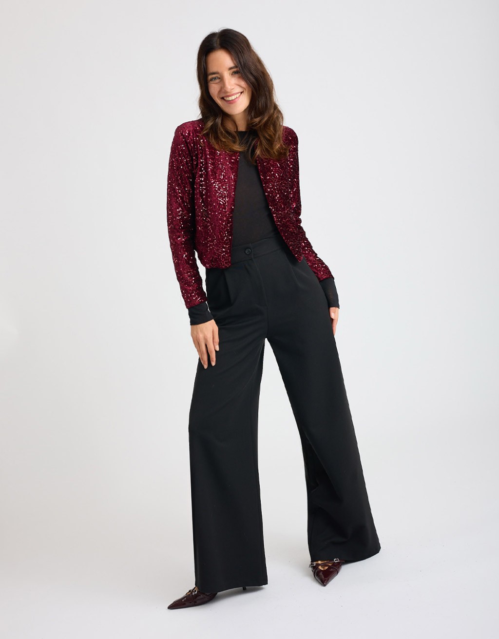 Indossalo sopra un top satinato e Pantalone Floccato Paillettes  per un total look scintillante da evento. Completa con tacchi e clutch essenziale.
