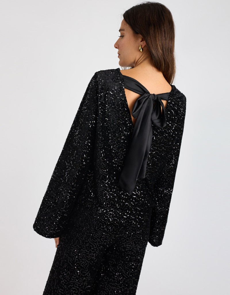 Un tocco di luce per i tuoi outfit più speciali! Questa maglia floccata con paillettes cucite unisce eleganza e femminilità grazie alla scollatura a giro impreziosita da un fiocco in tessuto effetto raso annodato sulla schiena. Morbida e luminosa, è perfetta per valorizzare qualsiasi look con discreta raffinatezza e un tocco glamour.