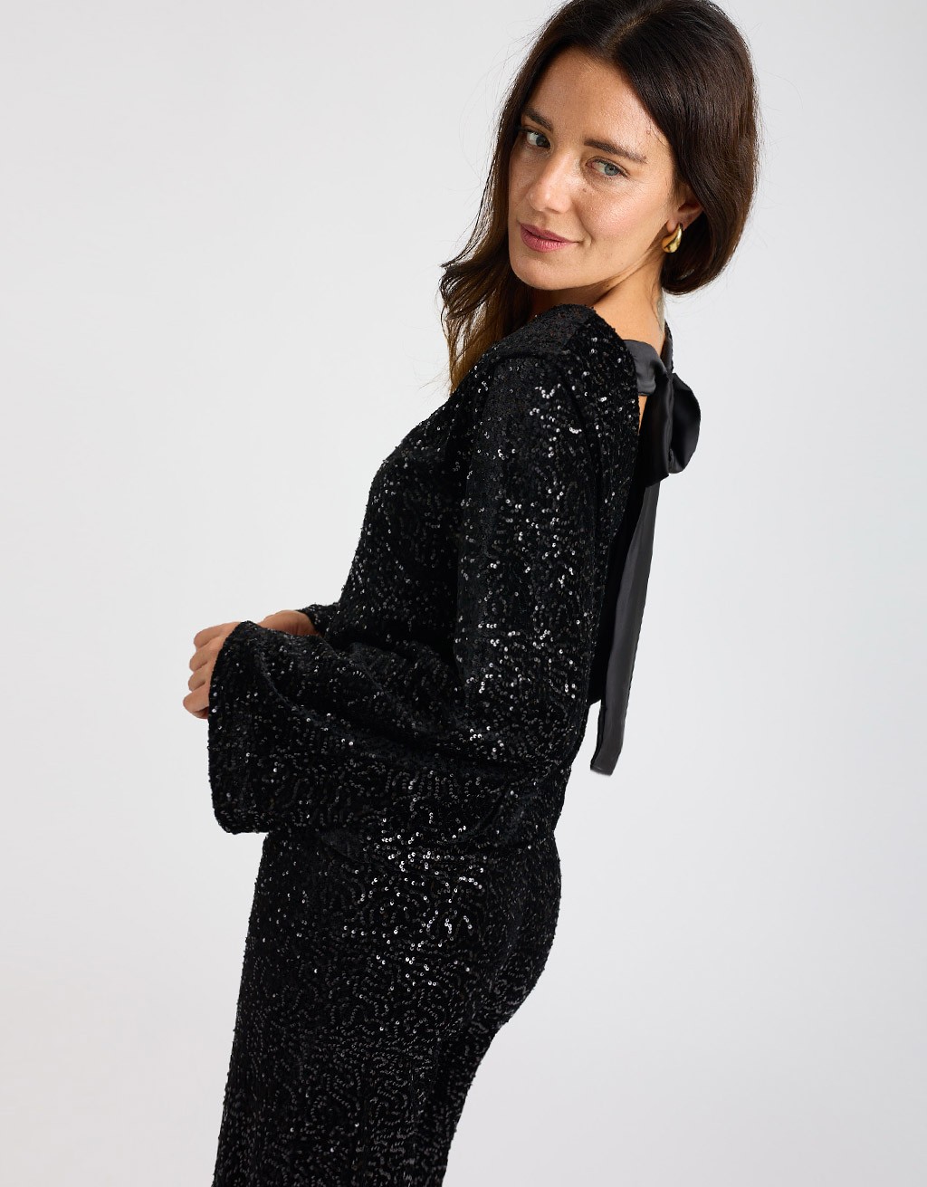 Abbinala al Pantalone Floccato Paillettes cod. 30559 per un total look scintillante, oppure con una gonna midi in raso e décolleté per una serata elegante. Bellissima anche con jeans neri e stivaletti per un mix casual-chic.