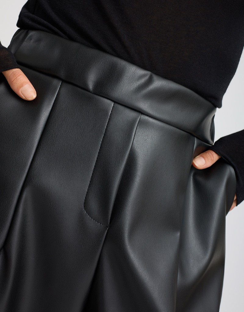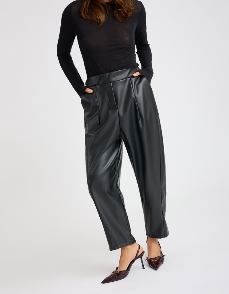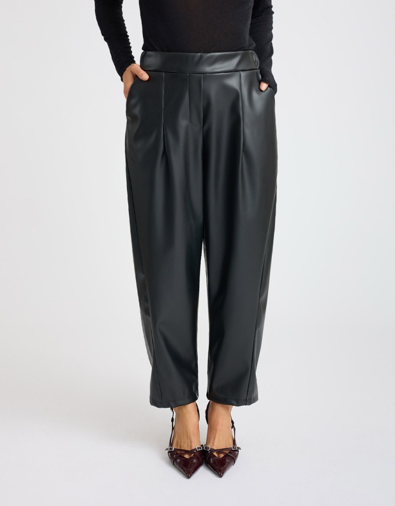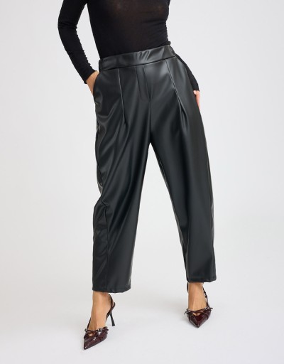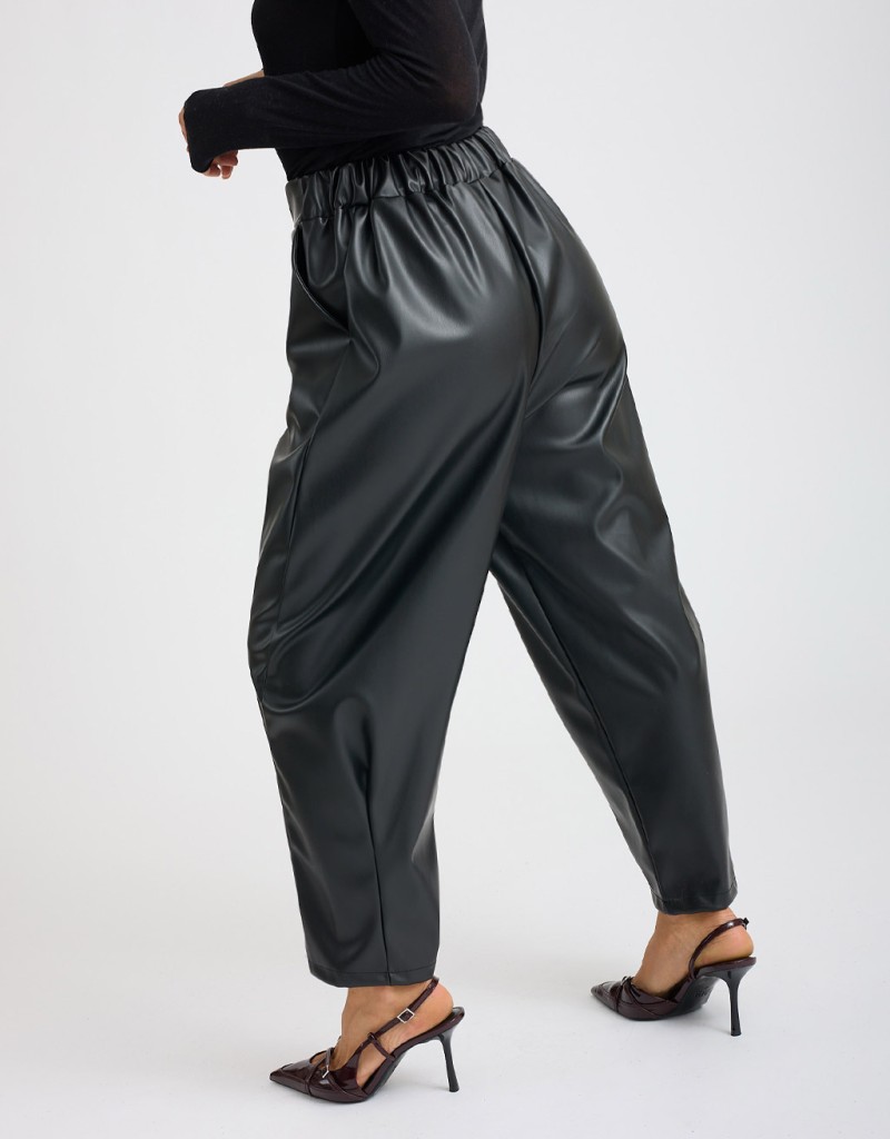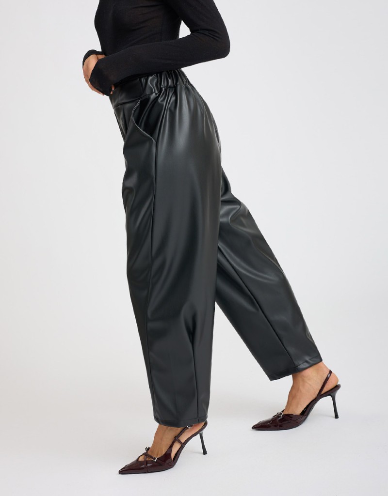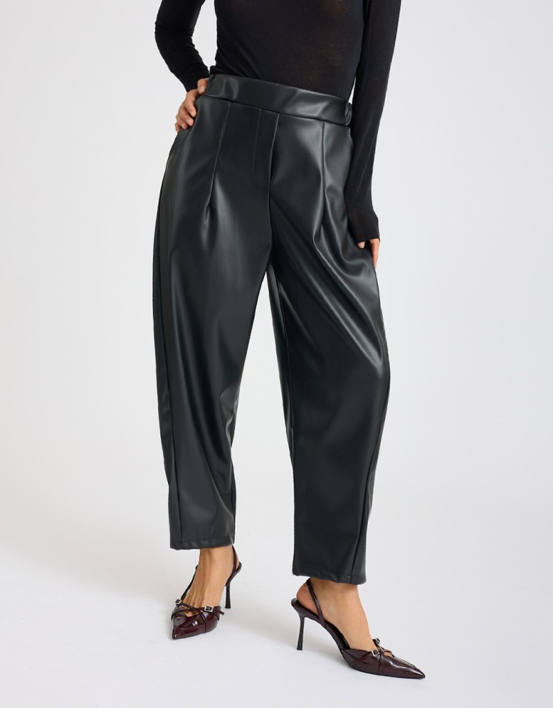 Grintoso ma super versatile, questo pantalone modello barrel in tessuto effetto pelle è il capo che rivoluziona i tuoi look di stagione. Le pinces frontali donano struttura e stile, mentre l’elastico in vita assicura comfort e una vestibilità perfetta. Perfetto per chi ama un tocco deciso ma sempre curato.