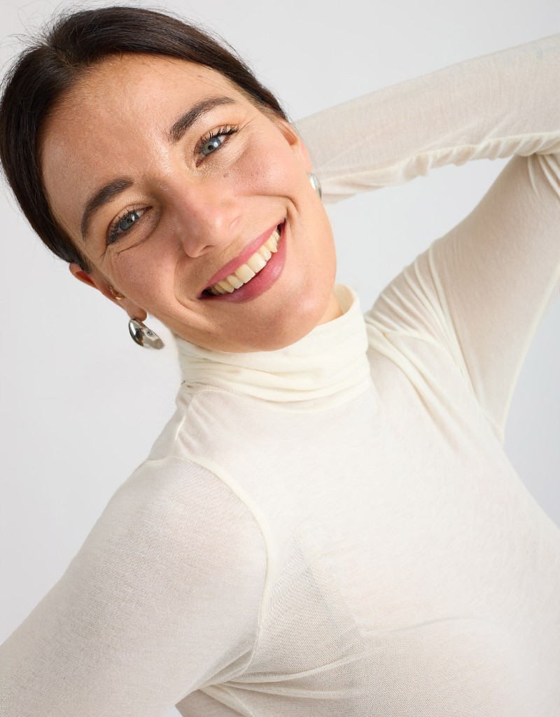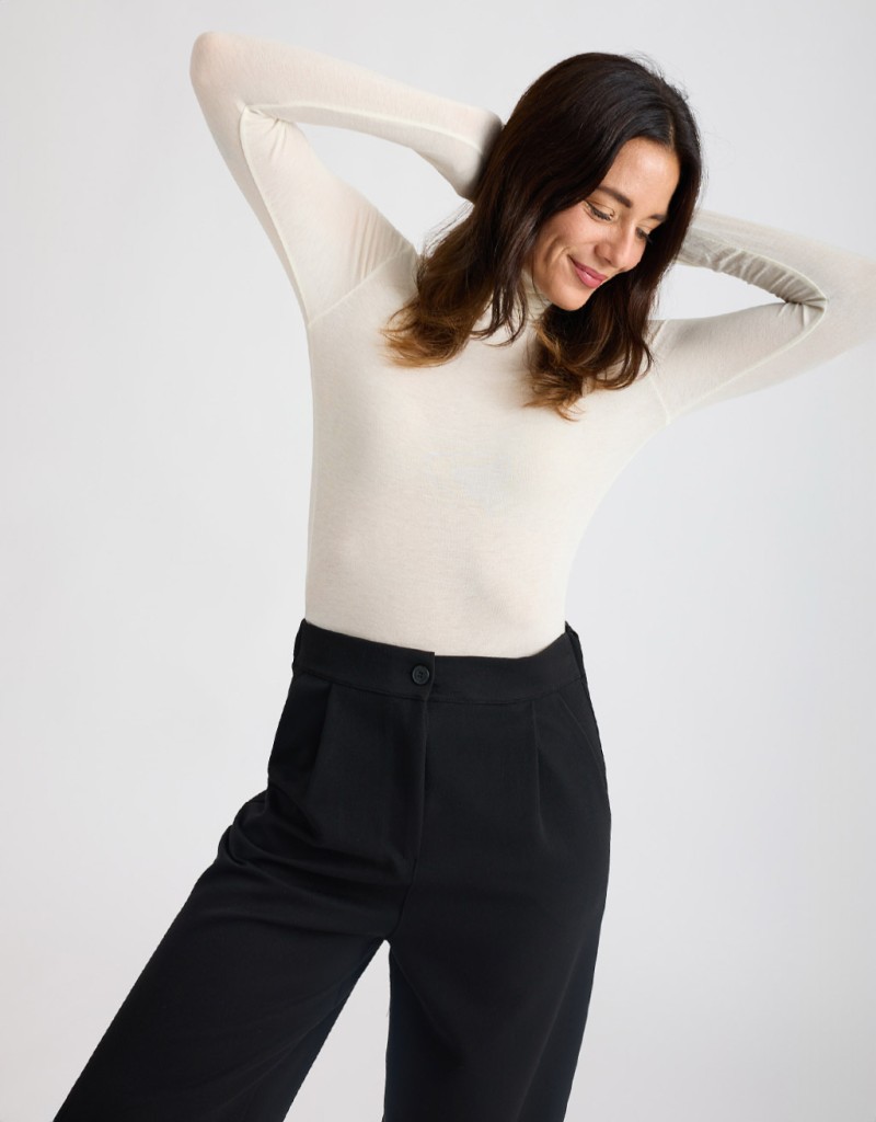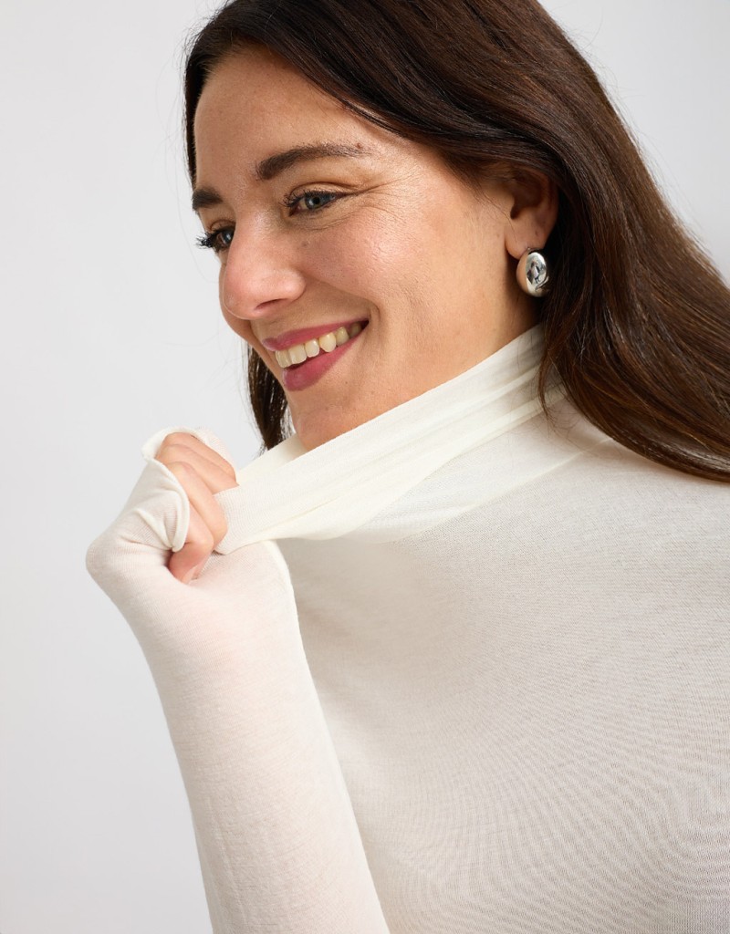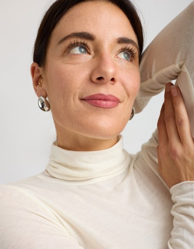 Maglietta basica ma sofisticata, realizzata in morbido tessuto con 10% di cashmere per un comfort unico. Il collo alto e la vestibilità aderente valorizzano la figura con eleganza, rendendola perfetta come sottogiacca o da indossare da sola nei look più minimal. Un capo essenziale, caldo e raffinato, ideale per la stagione fredda.