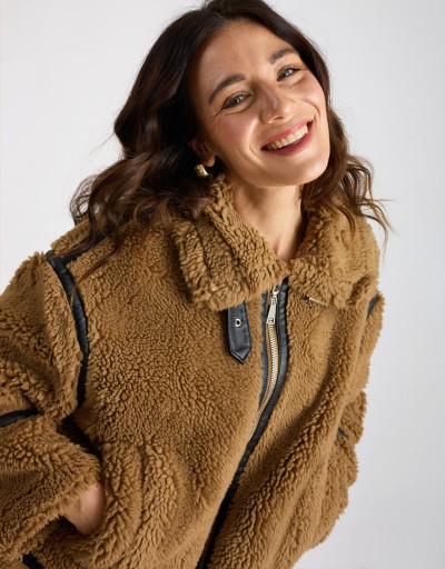 Un giubbotto corto dal carattere deciso e super trendy. L’esterno effetto pelliccia e l’interno effetto montone garantiscono calore e morbidezza, mentre le rifiniture e il cinturino in finta pelle da allacciare al collo aggiungono un tocco grintoso e raffinato. Perfetto per le giornate fredde, dona subito personalità a qualsiasi look.