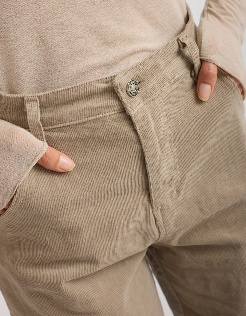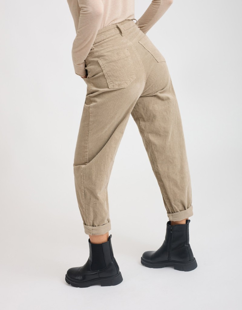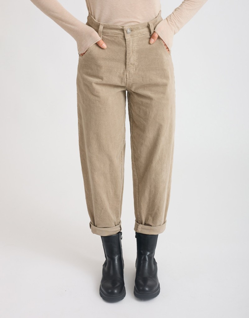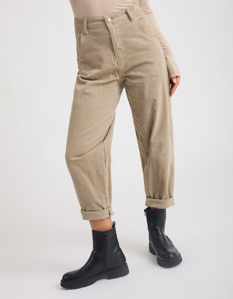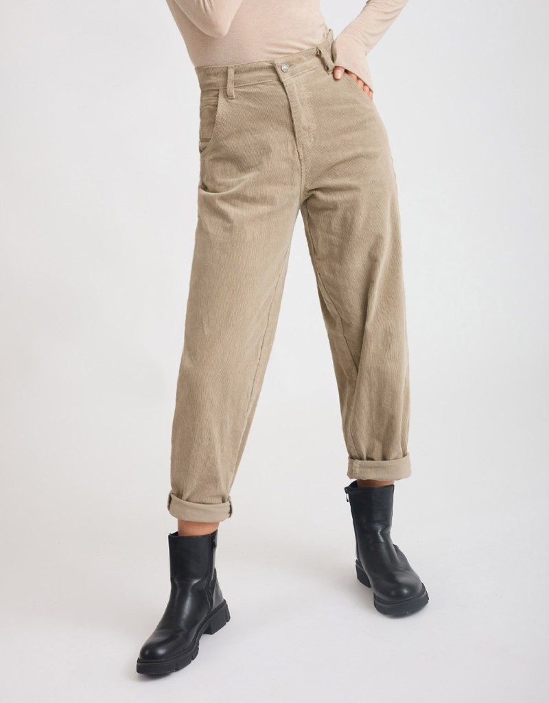 Un classico intramontabile rivisitato in chiave morbida e contemporanea! Questo pantalone in velluto a costine dona un tocco caldo e sofisticato a ogni look. Il taglio mom fit valorizza il punto vita e slancia la figura, mentre la chiusura con bottone e zip mantiene uno stile casual ma curato. Perfetto per la stagione fredda e per chi ama comfort e stile insieme.