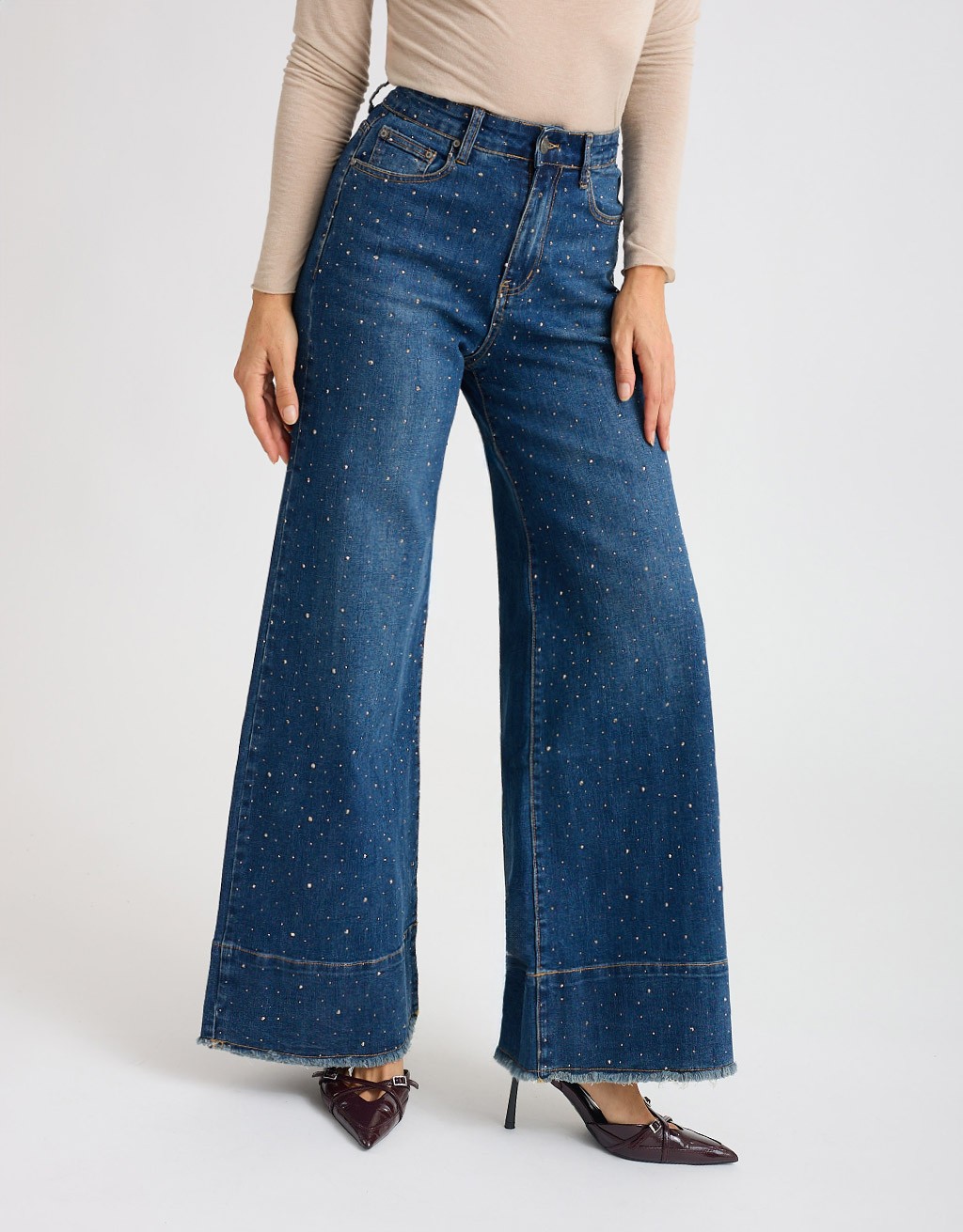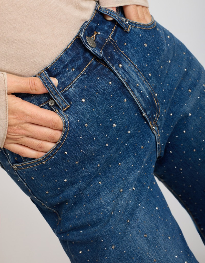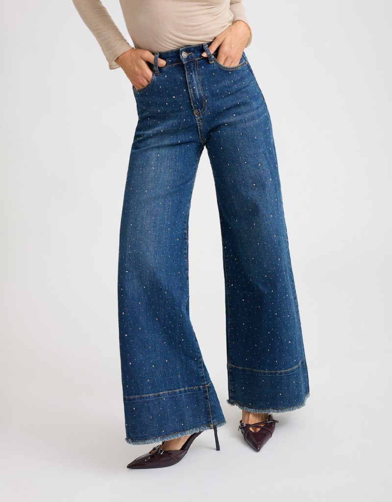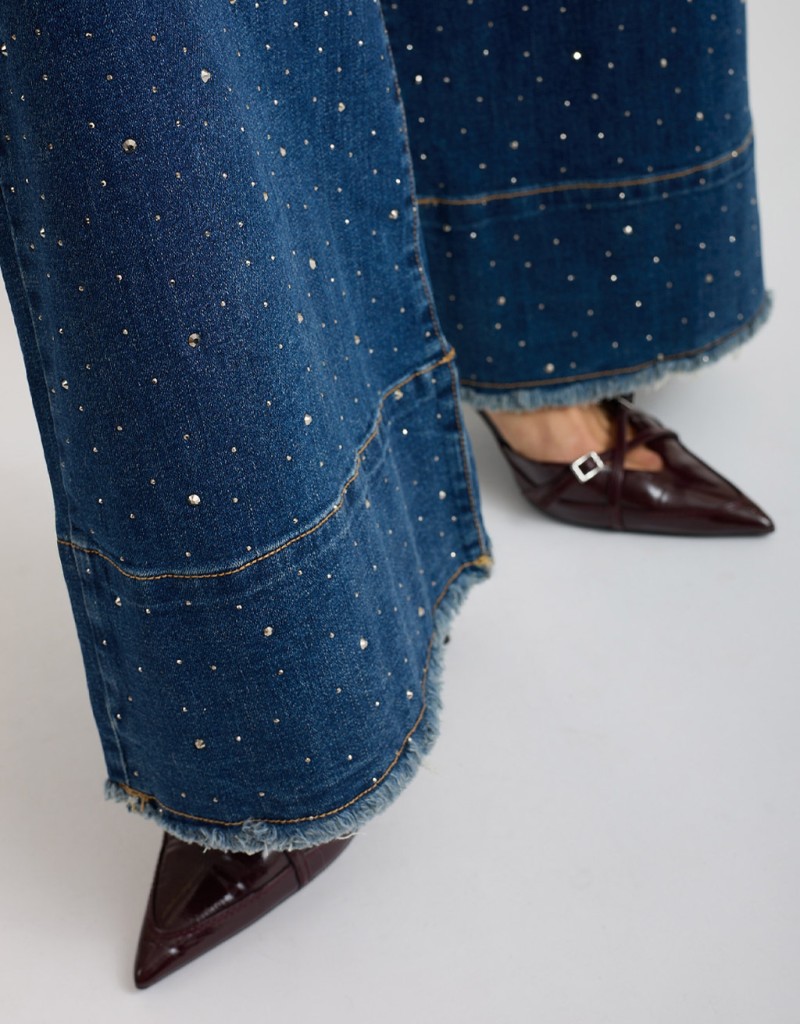 Un jeans che fa brillare ogni passo! Questo modello a palazzo in denim elasticizzato avvolge la figura con comfort e valorizza la silhouette grazie alla linea ampia e fluida. Le strass applicate su tutto il pantalone e la finta balza sul fondo aggiungono un tocco luminoso e originale, perfetto per dare carattere anche agli outfit più semplici.
