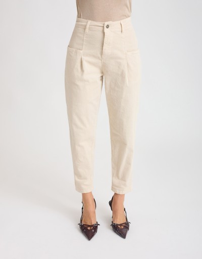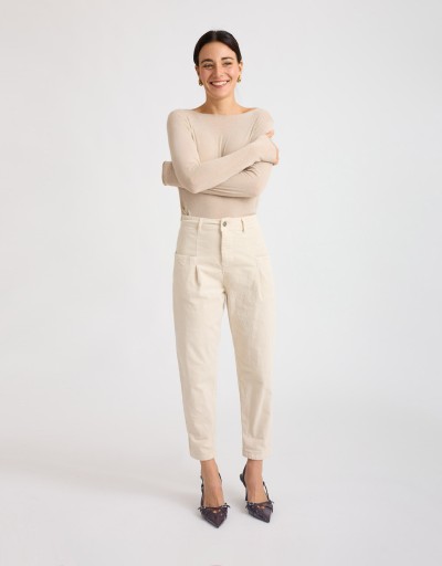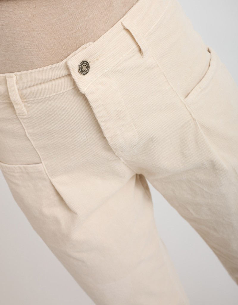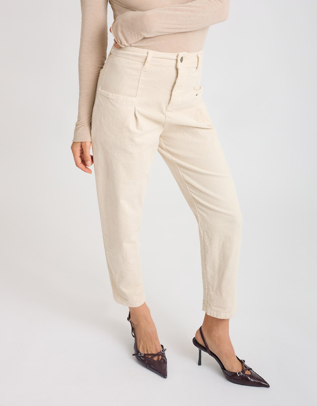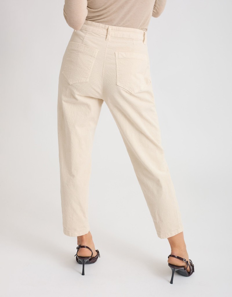 Pantalone in velluto a costine dal taglio mom fit, comodo e pieno di carattere. Il tessuto morbido e caldo lo rende perfetto per le giornate autunnali, mentre i tasconi frontali aggiungono un tocco casual e moderno. Un capo versatile che unisce stile e praticità, ideale per chi ama un look curato ma rilassato.
