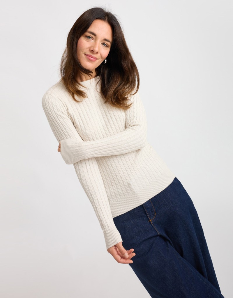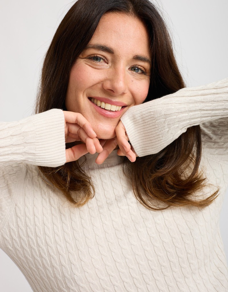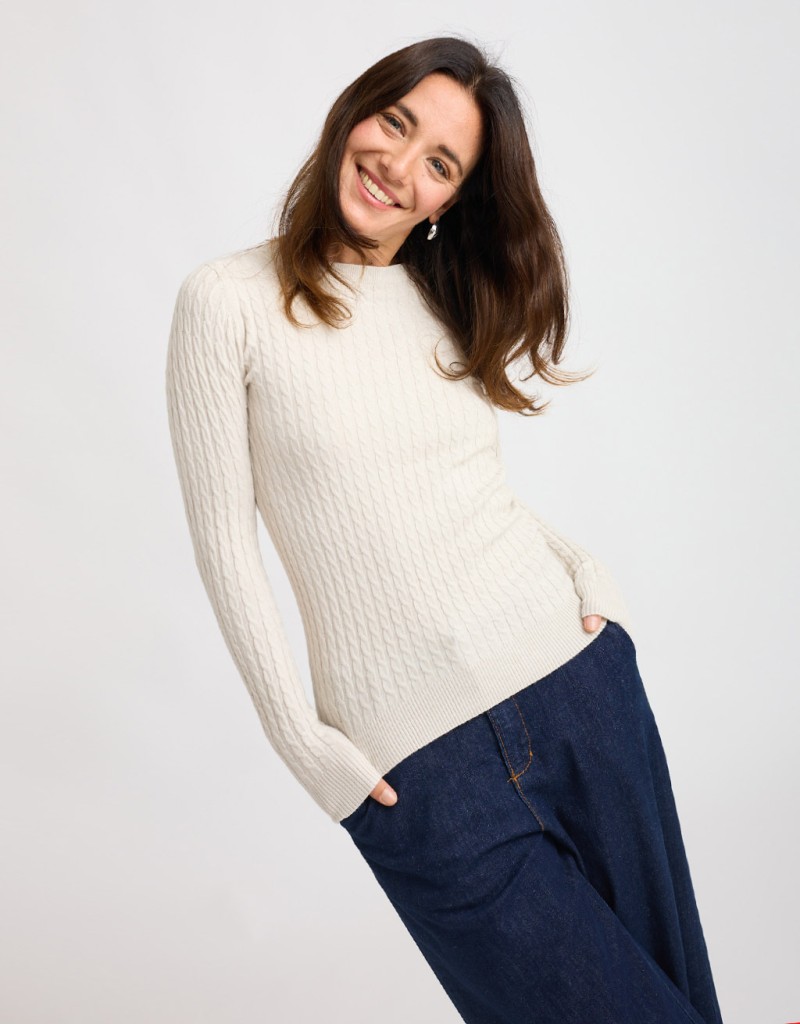 Maglioncino che avvolge con morbidezza e calore, grazie al suo filato soffice e alla raffinata lavorazione a treccia. La scollatura a giro e la vestibilità slim valorizzano la figura con semplicità ed eleganza, perfetto per aggiungere un tocco femminile ai look di tutti i giorni.