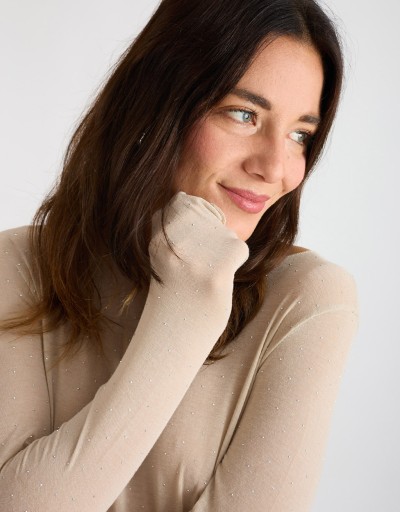 Maglietta basica ma sofisticata, realizzata in morbido tessuto con 10% di cashmere per un comfort unico. La vestibilità aderente e le strass incollate, valorizzano la figura con eleganza, rendendola perfetta come sottogiacca o da indossare da sola nei look più minimal. Un capo essenziale, caldo e raffinato, ideale per la stagione fredda.