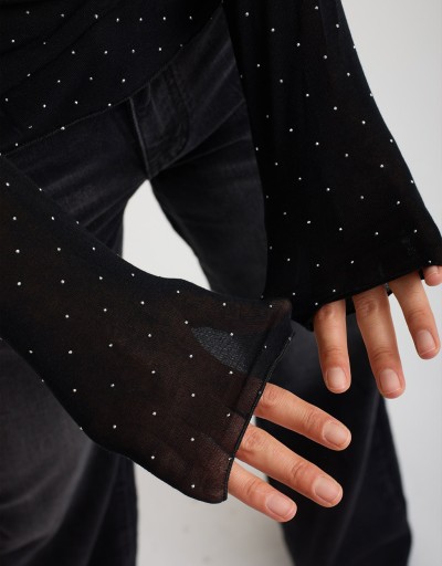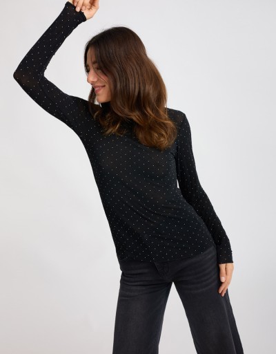 Maglietta basica ma sofisticata, realizzata in morbido tessuto con 10% di cashmere per un comfort unico. La vestibilità aderente e le strass incollate, valorizzano la figura con eleganza, rendendola perfetta come sottogiacca o da indossare da sola nei look più minimal. Un capo essenziale, caldo e raffinato, ideale per la stagione fredda.