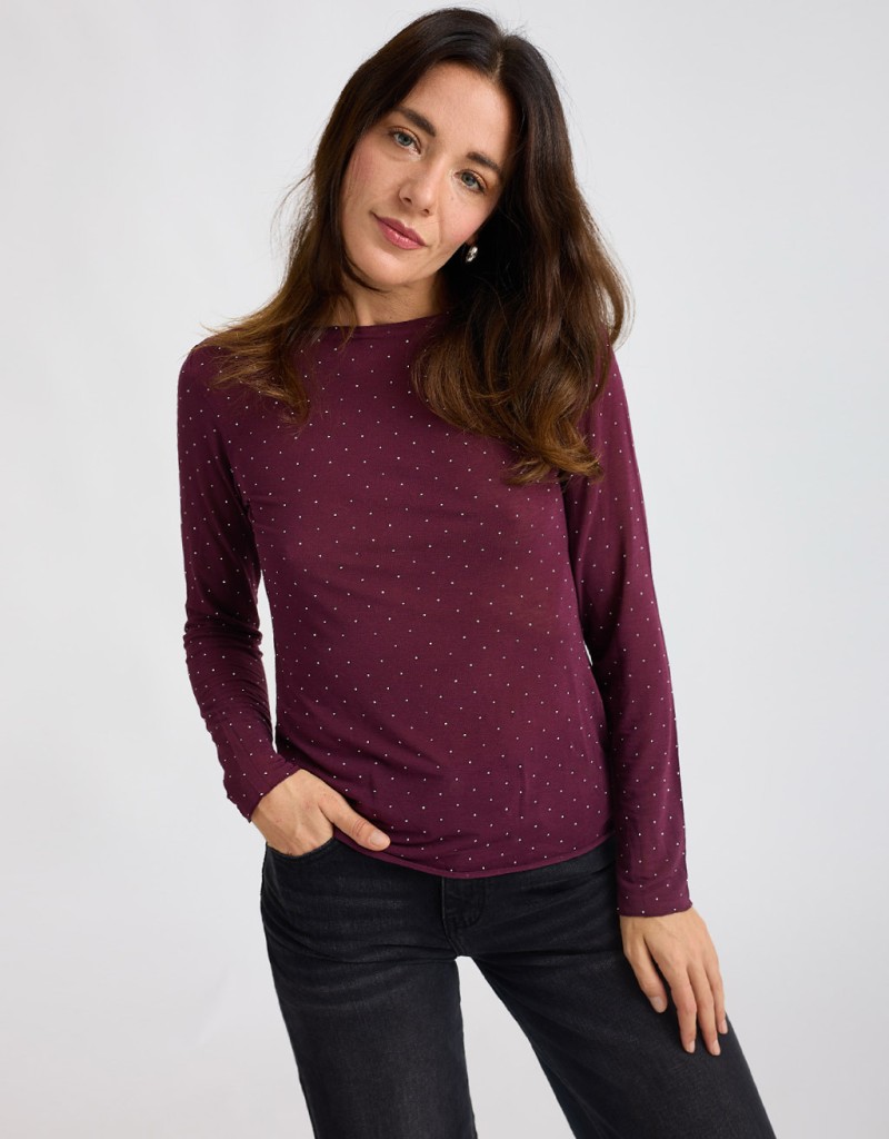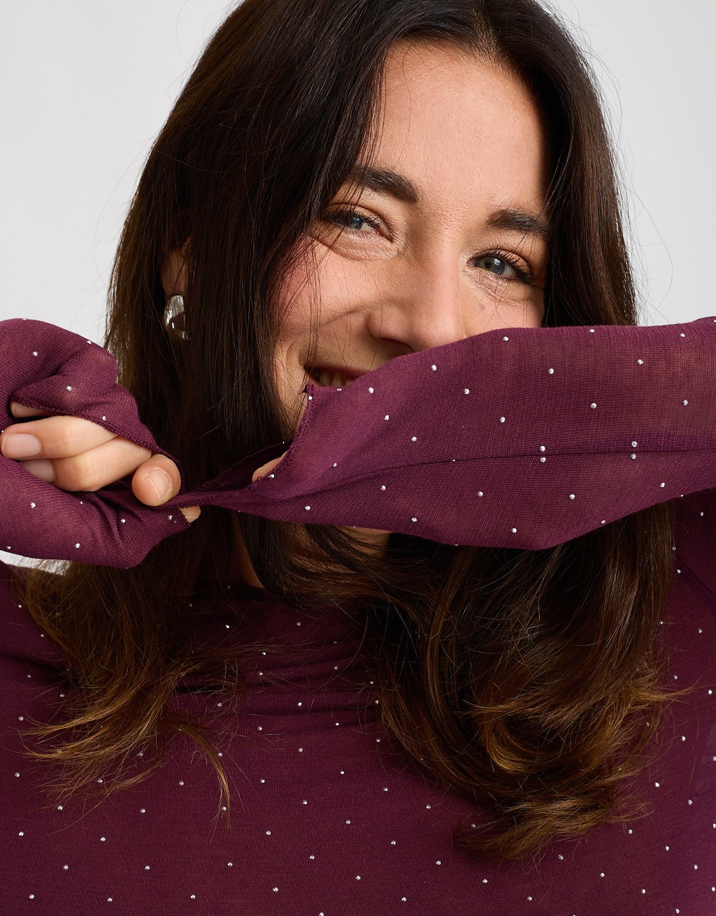 Maglietta basica ma sofisticata, realizzata in morbido tessuto con 10% di cashmere per un comfort unico. La vestibilità aderente e le strass incollate, valorizzano la figura con eleganza, rendendola perfetta come sottogiacca o da indossare da sola nei look più minimal. Un capo essenziale, caldo e raffinato, ideale per la stagione fredda.