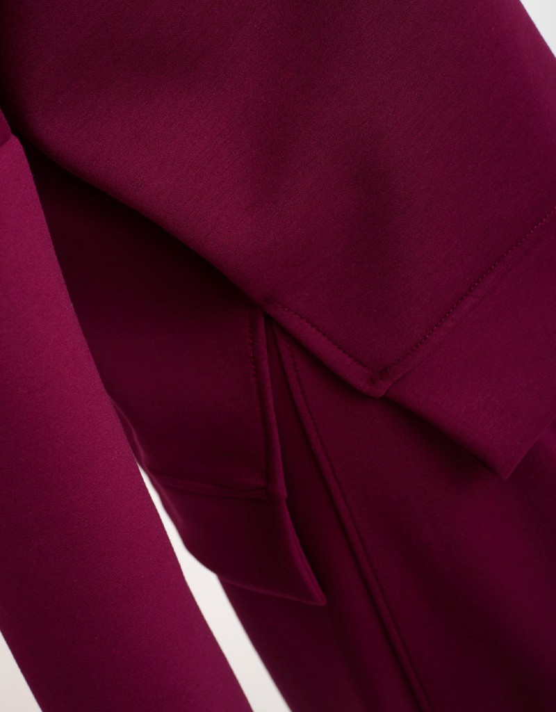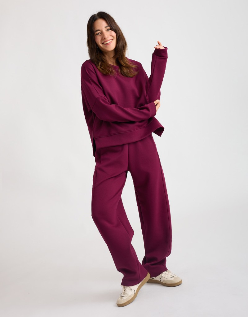 Comodo ma super trendy: questo completo in scuba felpato è la coccola perfetta per affrontare le giornate più fresche con stile. La maglia dal taglio morbido e gli spacchetti laterali regala movimento e femminilità, mentre il pantalone modello barrel dona un tocco contemporaneo e rilassato. Ideale per chi ama sentirsi curata anche nei look casual.