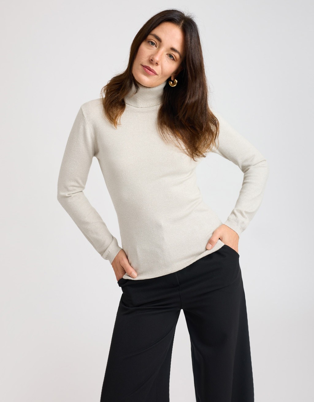Un maglioncino elegante e luminoso, realizzato in un tessuto morbido e caldo impreziosito da delicati fili di lurex che donano un tocco brillante al tuo look. La linea slim valorizza la silhouette con naturalezza, rendendolo perfetto sia per il giorno che per la sera. Un capo semplice ma d’effetto, ideale per affrontare con stile la stagione fredda.