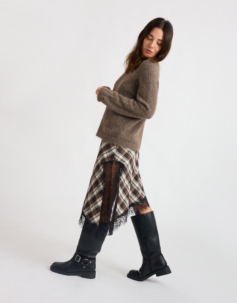 Una gonna midi dal fascino sofisticato e contemporaneo. Il tessuto in flanella, morbido e caldo, avvolge la figura con eleganza, mentre il taglio asimmetrico e lo spacco laterale donano movimento e carattere. Il dettaglio in pizzo sul fondo aggiunge un tocco romantico, mentre l’elastico in vita assicura una vestibilità comoda e adattabile: perfetta per le giornate fresche con un tocco di charme.