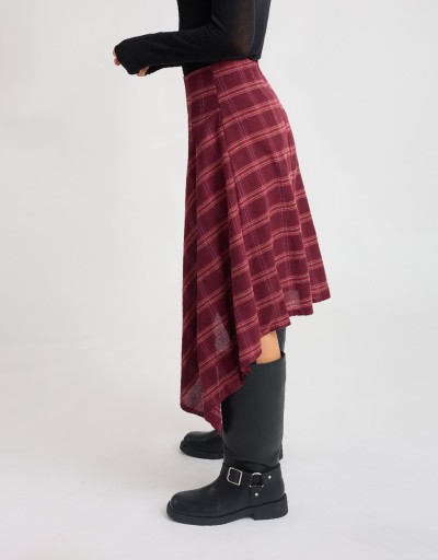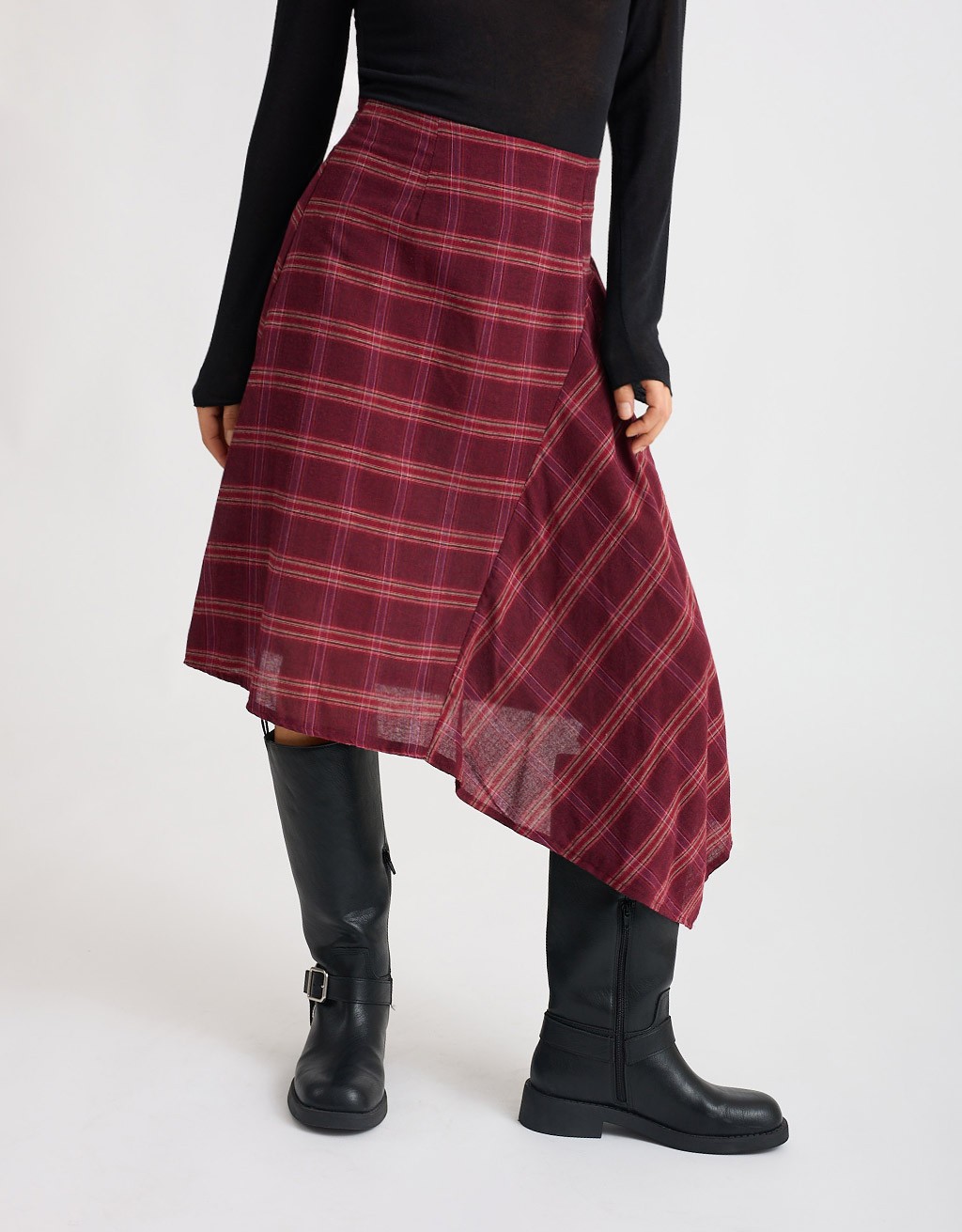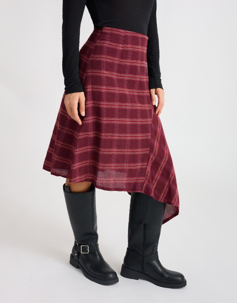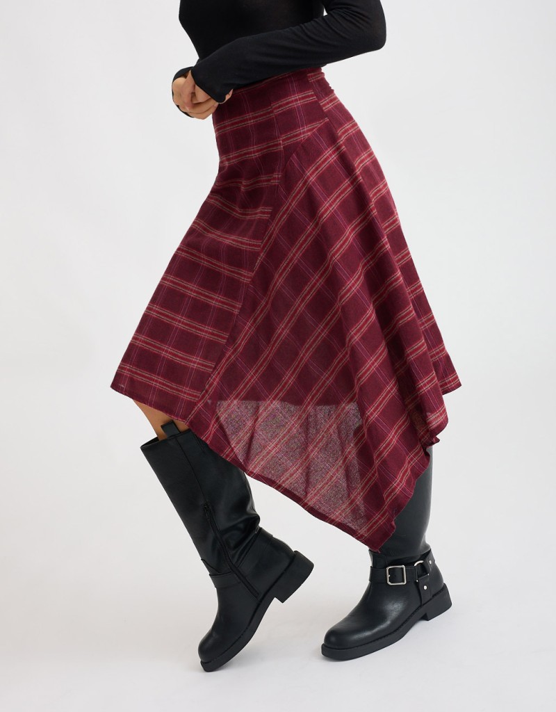 Gonna midi in calda flanella fantasia a quadri, perfetta per dare un tocco ricercato ai look di stagione. Il modello asimmetrico con ampia balza laterale crea un movimento fluido e femminile, mentre la chiusura posteriore con cerniera nascosta mantiene la linea pulita e raffinata. Un capo versatile e attuale, ideale per look da giorno con un twist sofisticato.