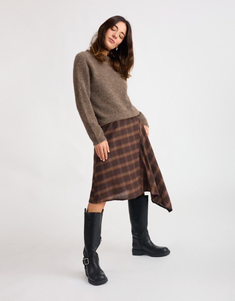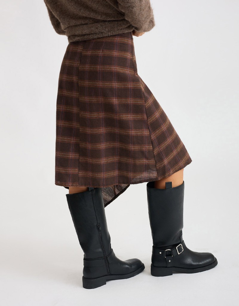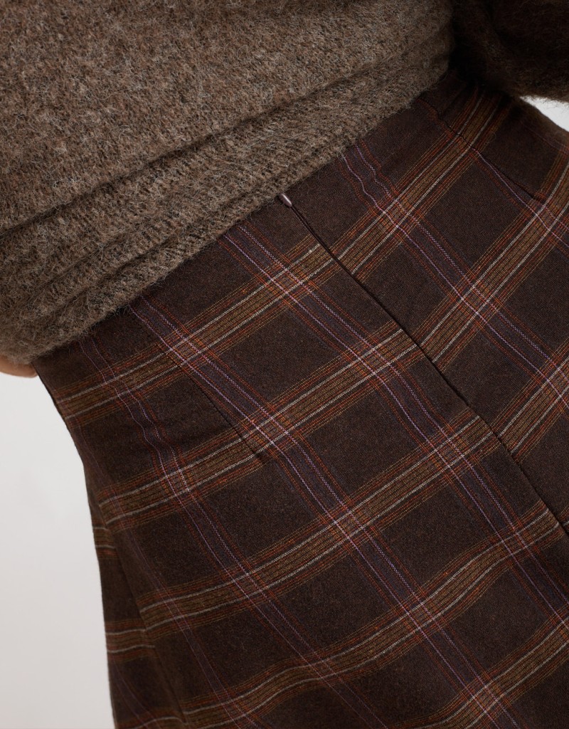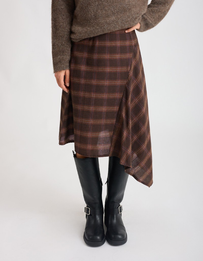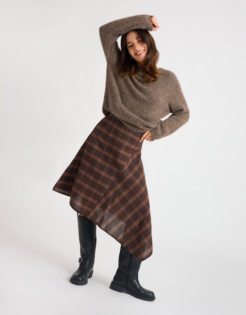 Gonna midi in calda flanella fantasia a quadri, perfetta per dare un tocco ricercato ai look di stagione. Il modello asimmetrico con ampia balza laterale crea un movimento fluido e femminile, mentre la chiusura posteriore con cerniera nascosta mantiene la linea pulita e raffinata. Un capo versatile e attuale, ideale per look da giorno con un twist sofisticato.