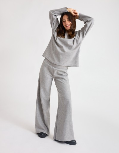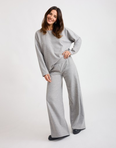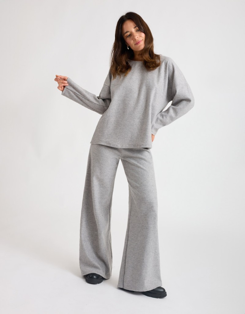 Un completo caldo e avvolgente in morbido tessuto melange, perfetto per affrontare le giornate fredde con stile. La maglia over dal taglio morbido dona un’aria rilassata ma curata, mentre il pantalone a palazzo con fascia elastica in vita assicura comfort e libertà di movimento. Un look ideale per la stagione invernale.