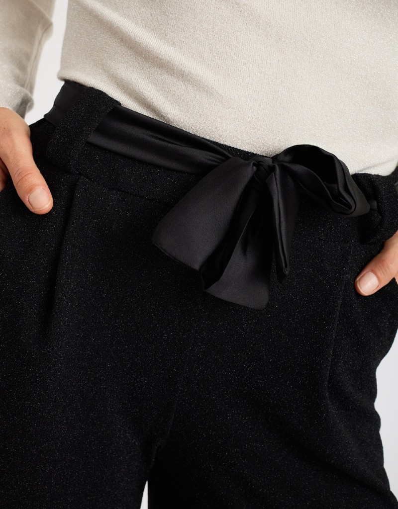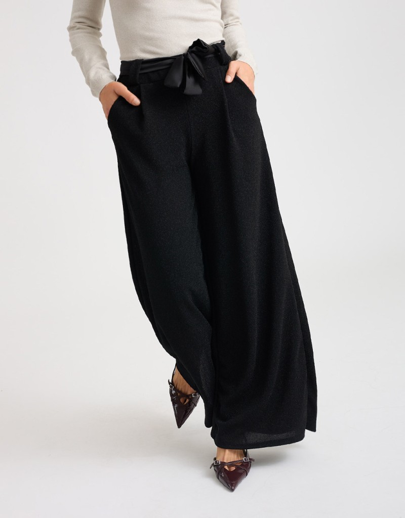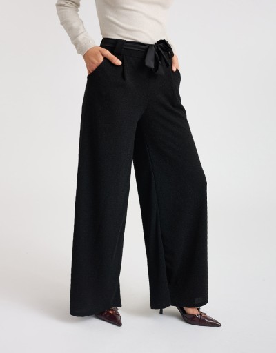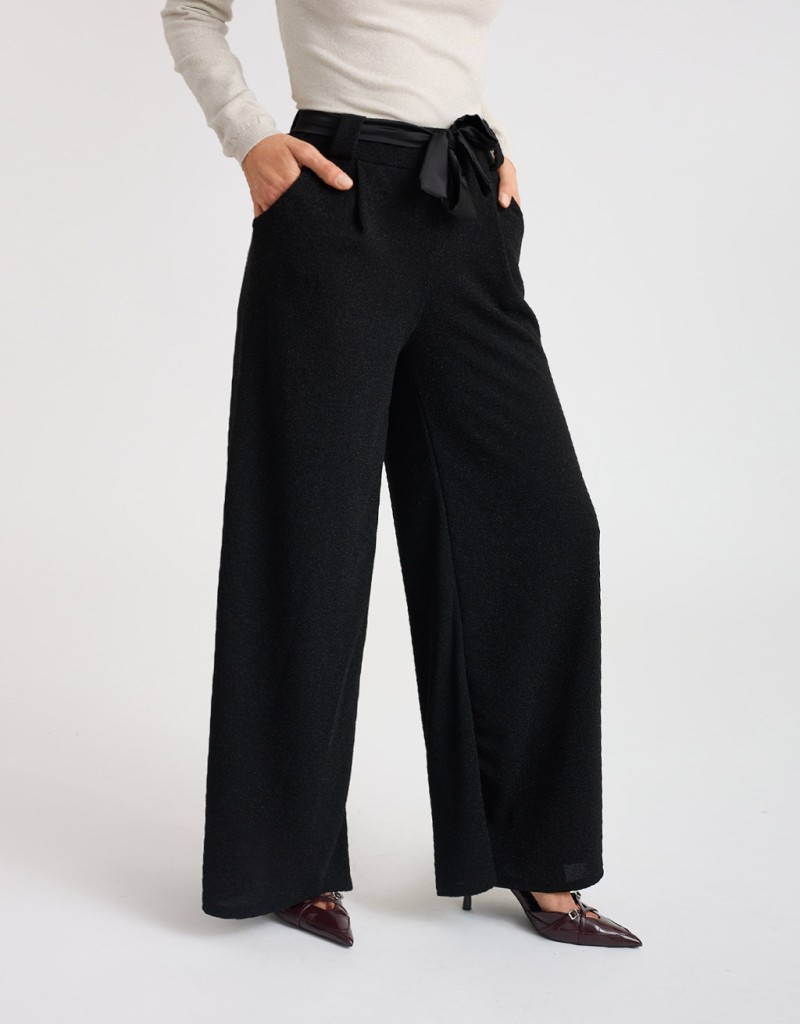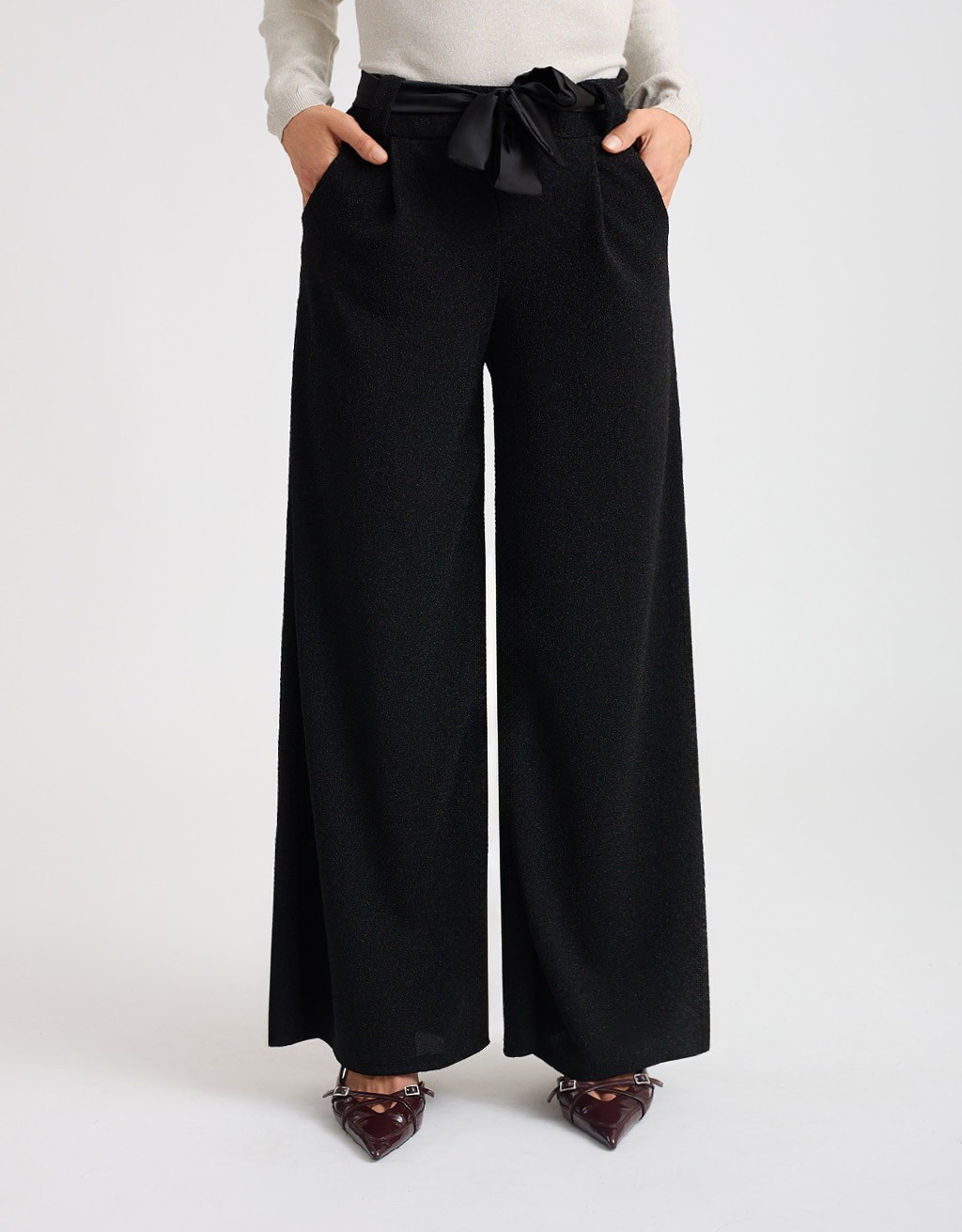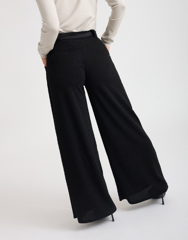 Pantalone elegante e confortevole in morbido tessuto elasticizzato con lurex. Il modello a palazzo slancia la figura con naturalezza, mentre la fusciacca in raso e l’elastico in vita assicurano una vestibilità perfetta e femminile. Le pinces frontali aggiungono un tocco curato e sartoriale.