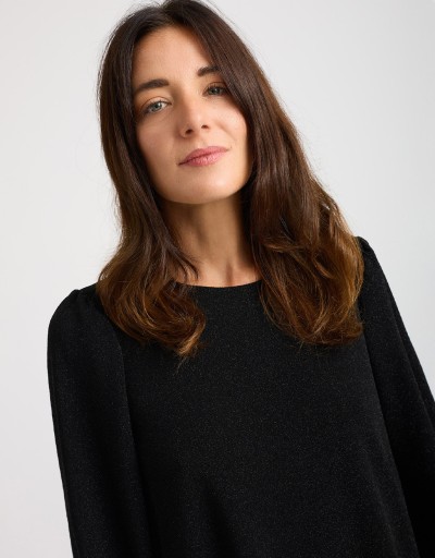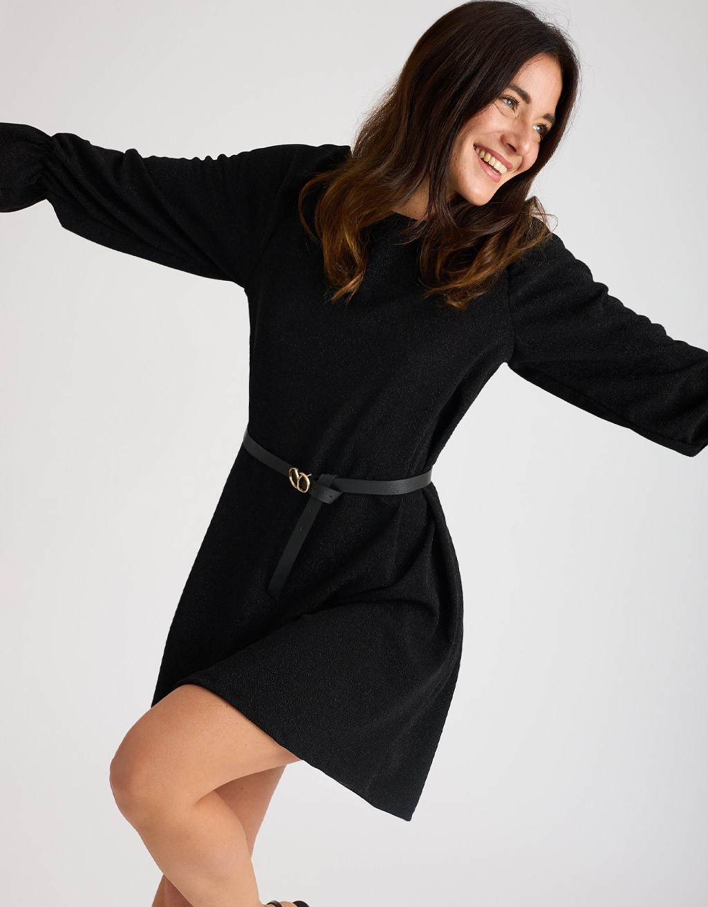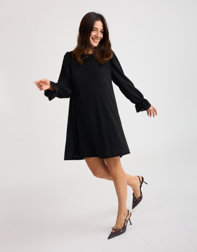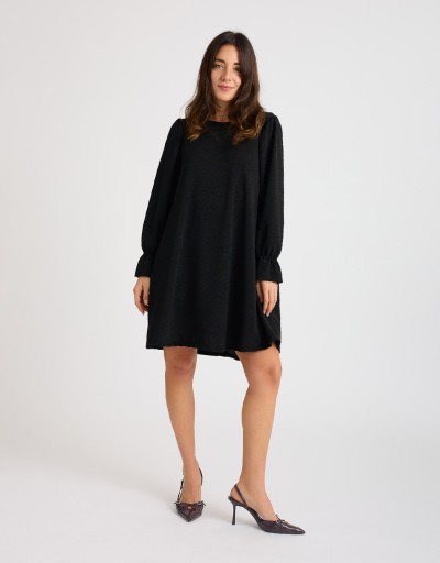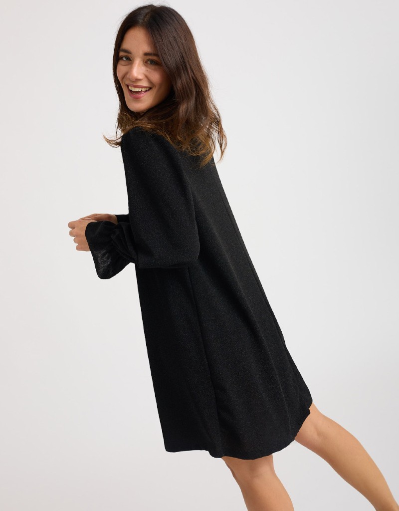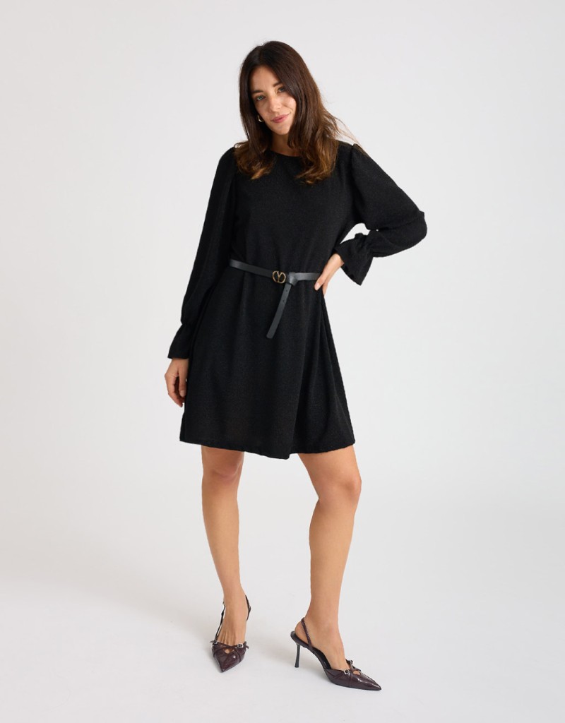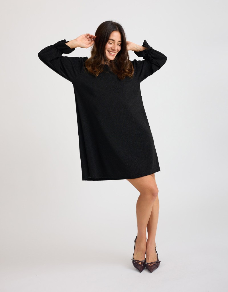 Abito corto in morbido tessuto elasticizzato con lurex che illumina la figura con eleganza discreta. La scollatura a giro si chiude dietro con un piccolo bottoncino, creando una raffinata apertura a goccia sulla schiena. Il taglio morbido si adatta a diverse silhouette, ma può essere valorizzato con la cintura regolabile in dotazione. Le maniche lunghe con volant completano il look.