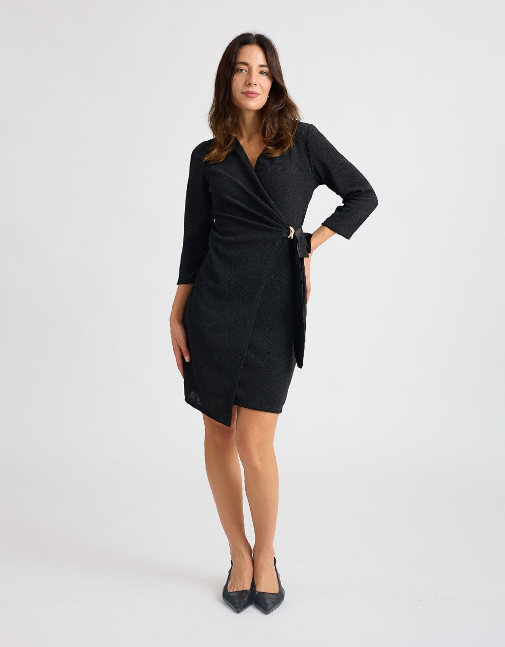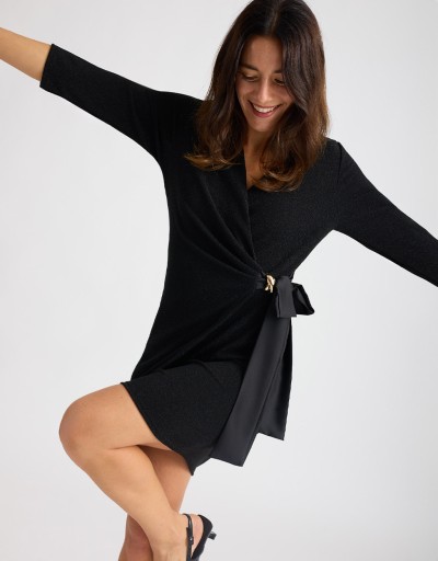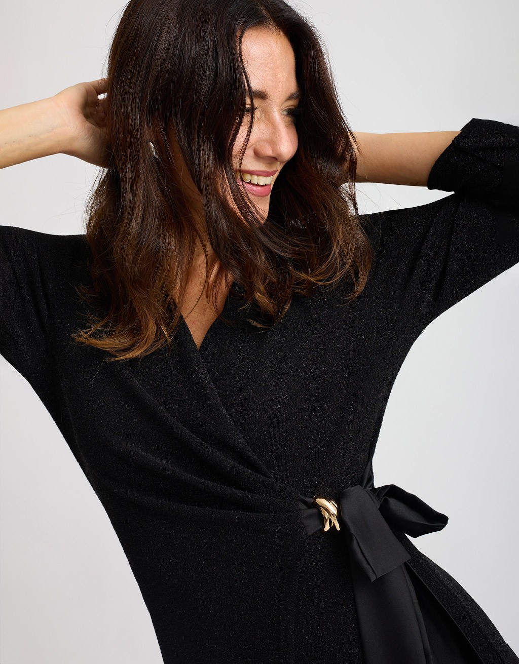 Un abito che unisce eleganza e comfort con un tocco di luce. Realizzato in tessuto morbido ed elasticizzato con filati lurex, avvolge la figura con delicatezza e dona una luminosità raffinata. Il modello a portafoglio, chiuso lateralmente da un fiocco in raso, valorizza il punto vita e crea un effetto femminile e armonioso. La scollatura ad incrocio completa il look con sensualità discreta.