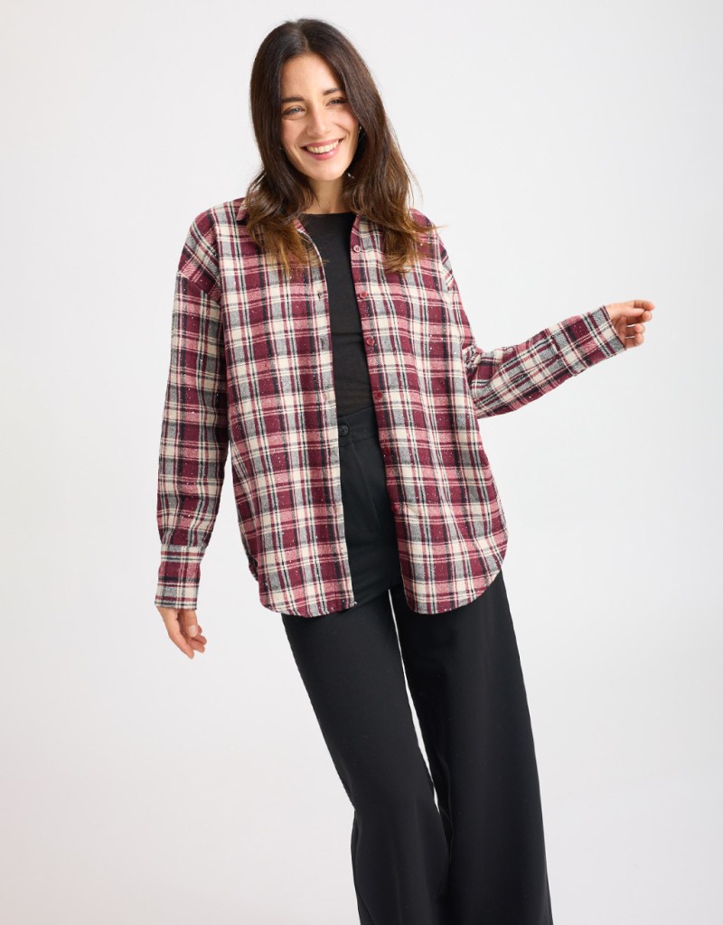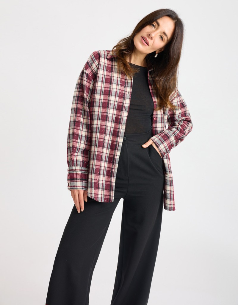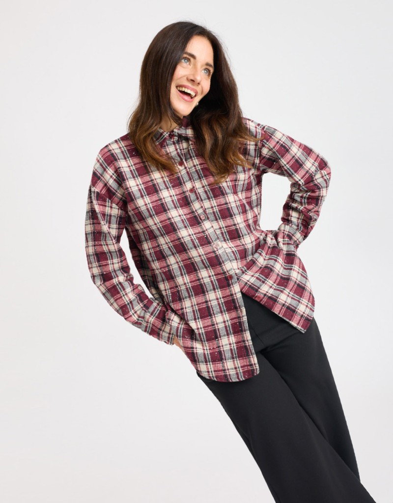 Questa camicia unisce la morbidezza del tessuto caldo alla vivacità della fantasia quadro, illuminata da strass incollati che aggiungono un tocco brillante ma discreto. La vestibilità comoda la rende perfetta per le giornate di stagione, facile da indossare dal mattino alla sera senza rinunciare allo stile.