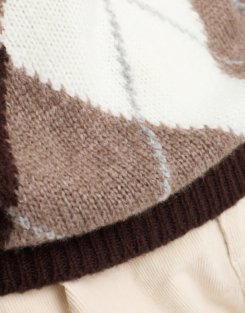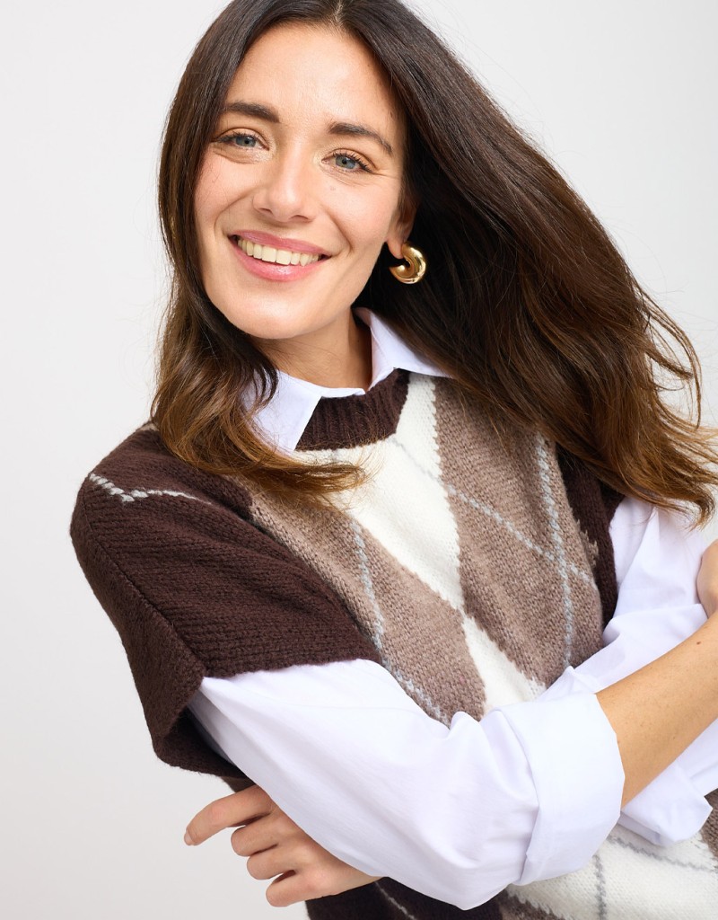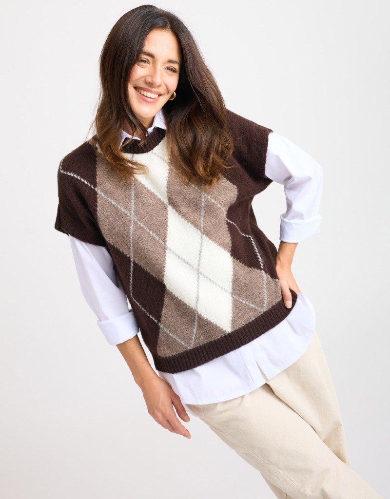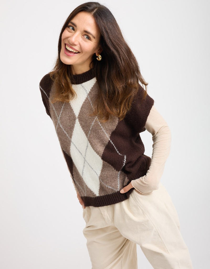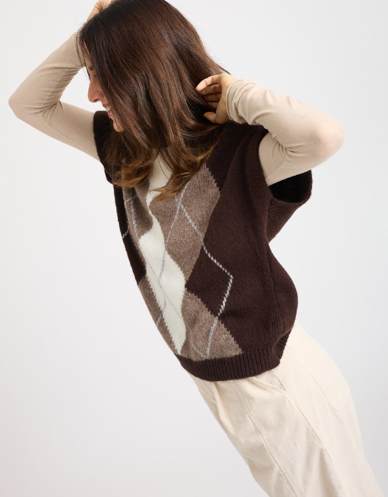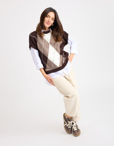 Un gilet caldo e morbidissimo, ideale per aggiungere un tocco grafico ai look di stagione. La stampa a rombi gli dà un’aria moderna e vivace, mentre la vestibilità morbida lo rende comodo da indossare tutto il giorno, perfetto nelle giornate fresche senza rinunciare allo stile.