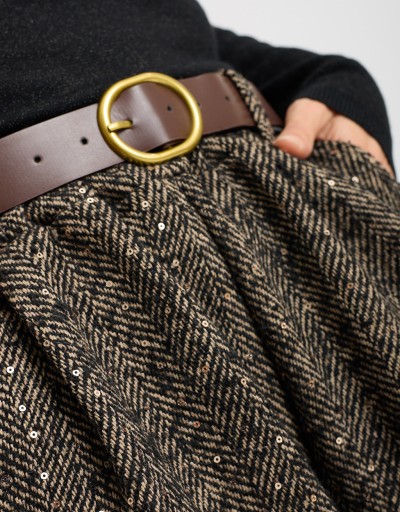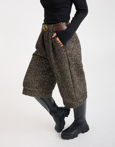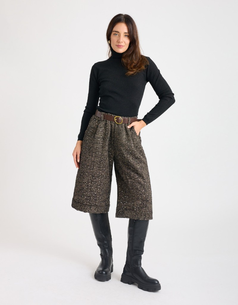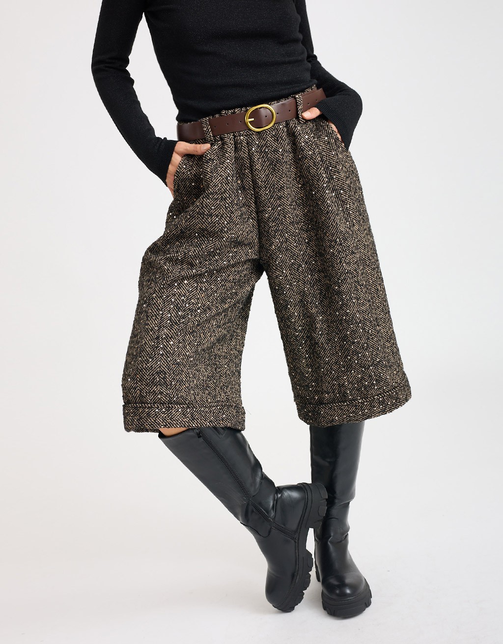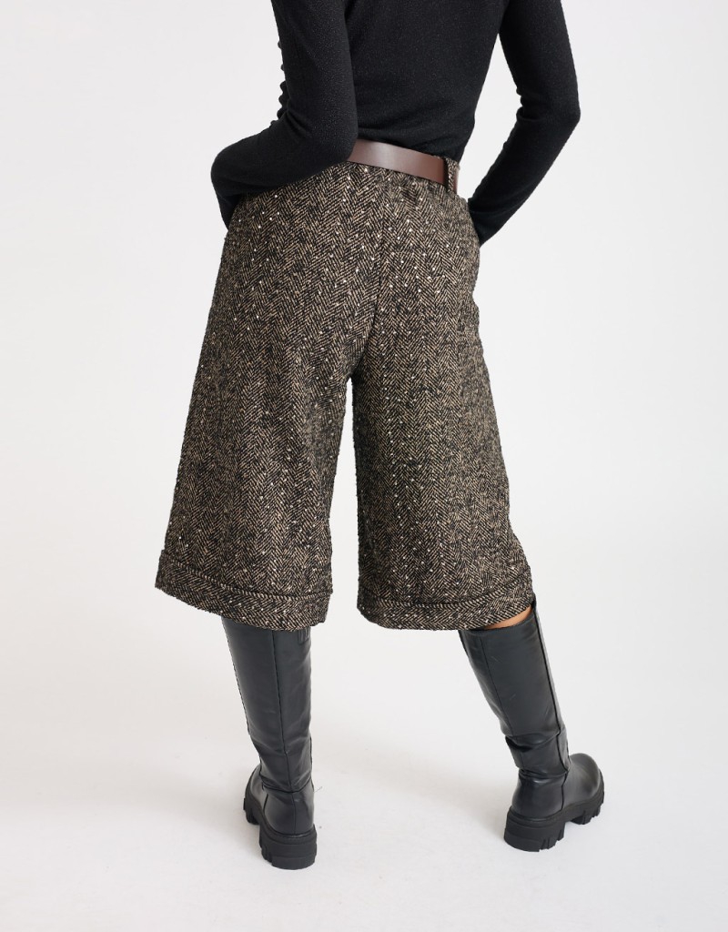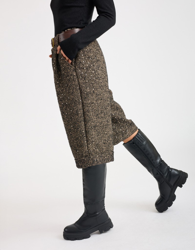 Questi bermuda in morbido e caldo panno uniscono la classicità della fantasia spinata a un tocco luminoso grazie alle paillettes, per un look moderno e deciso. Le pinces frontali donano una linea elegante, mentre l’elastico in vita assicura comfort e una vestibilità che si adatta facilmente alla figura.