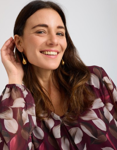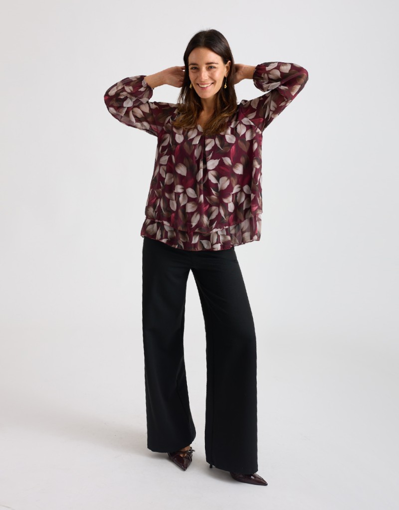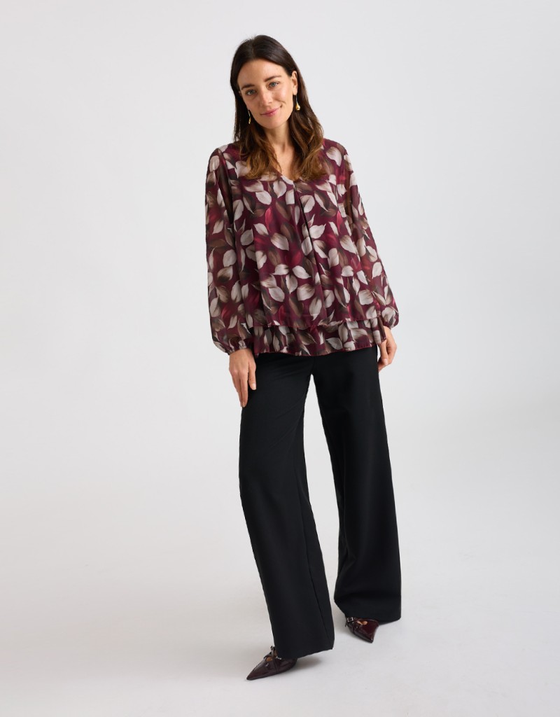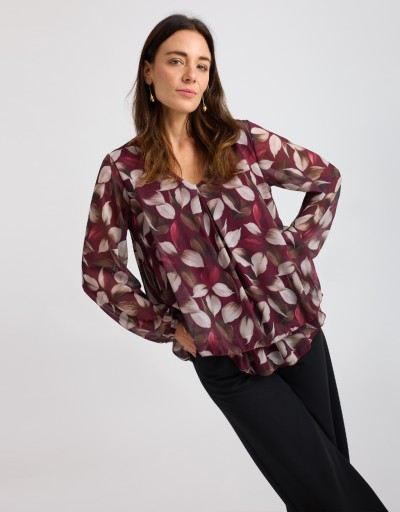 Questa camicetta over in georgette fantasia ha una scollatura a V morbida e femminile, è composta da due strati sovrapposti che coprono le trasparenze e creano una lieve balza. Il fit ampio dona movimento e comfort, rendendola ideale per aggiungere un tocco elegante ma disinvolto ai look di tutti i giorni.