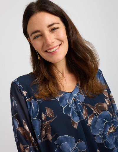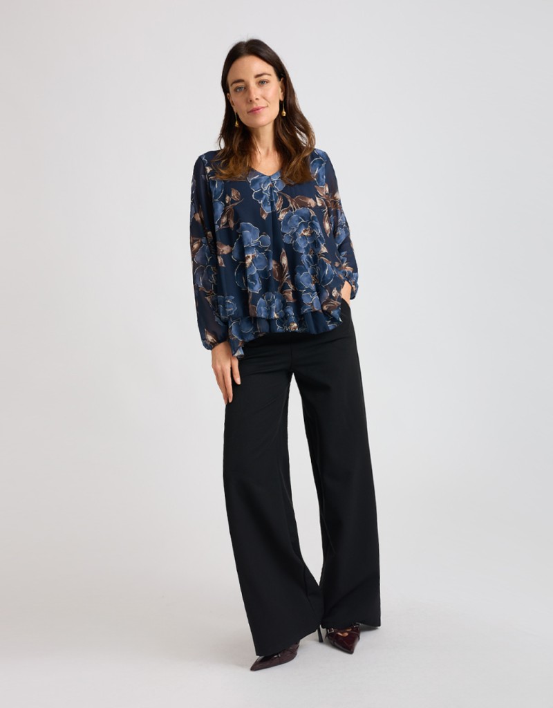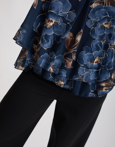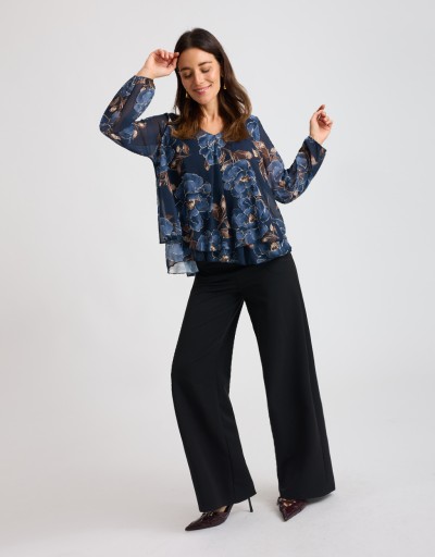 Questa camicetta over in georgette fantasia ha una scollatura a V morbida e femminile, è composta da due strati sovrapposti che coprono le trasparenze e creano una lieve balza. Il fit ampio dona movimento e comfort, rendendola ideale per aggiungere un tocco elegante ma disinvolto ai look di tutti i giorni.