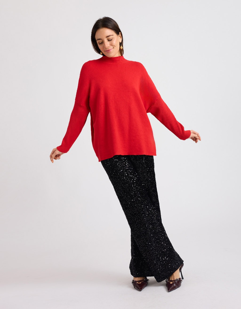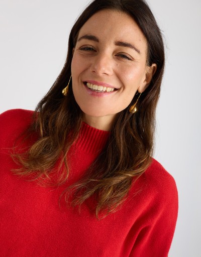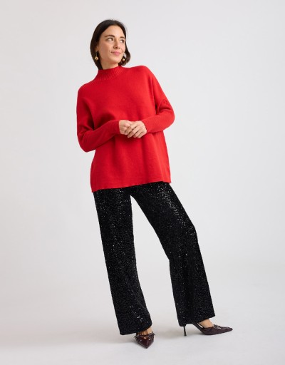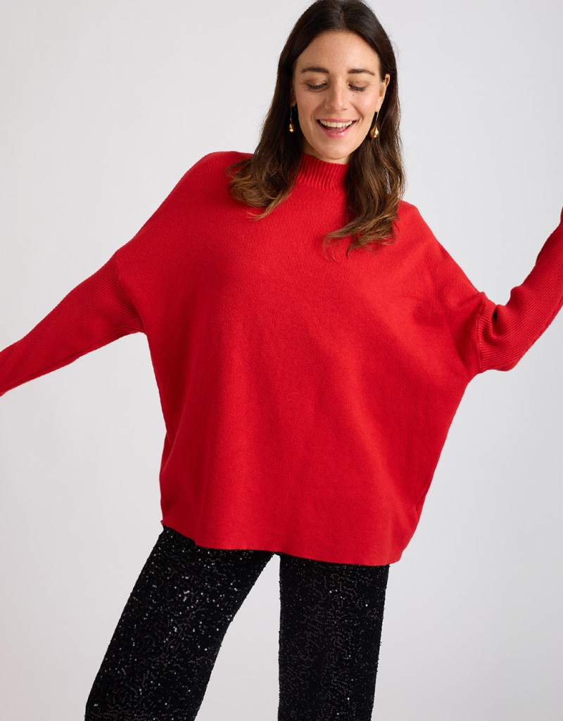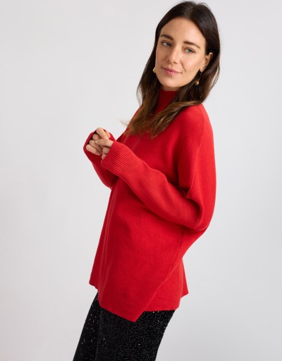 Questo maglione in tessuto morbido e caldo è il compagno ideale per le giornate fresche: il collo a lupetto avvolge senza stringere e la vestibilità over dona un look moderno e rilassato. Le maniche a costine aggiungono un tocco di stile che lo rende facile da indossare dalla mattina alla sera.