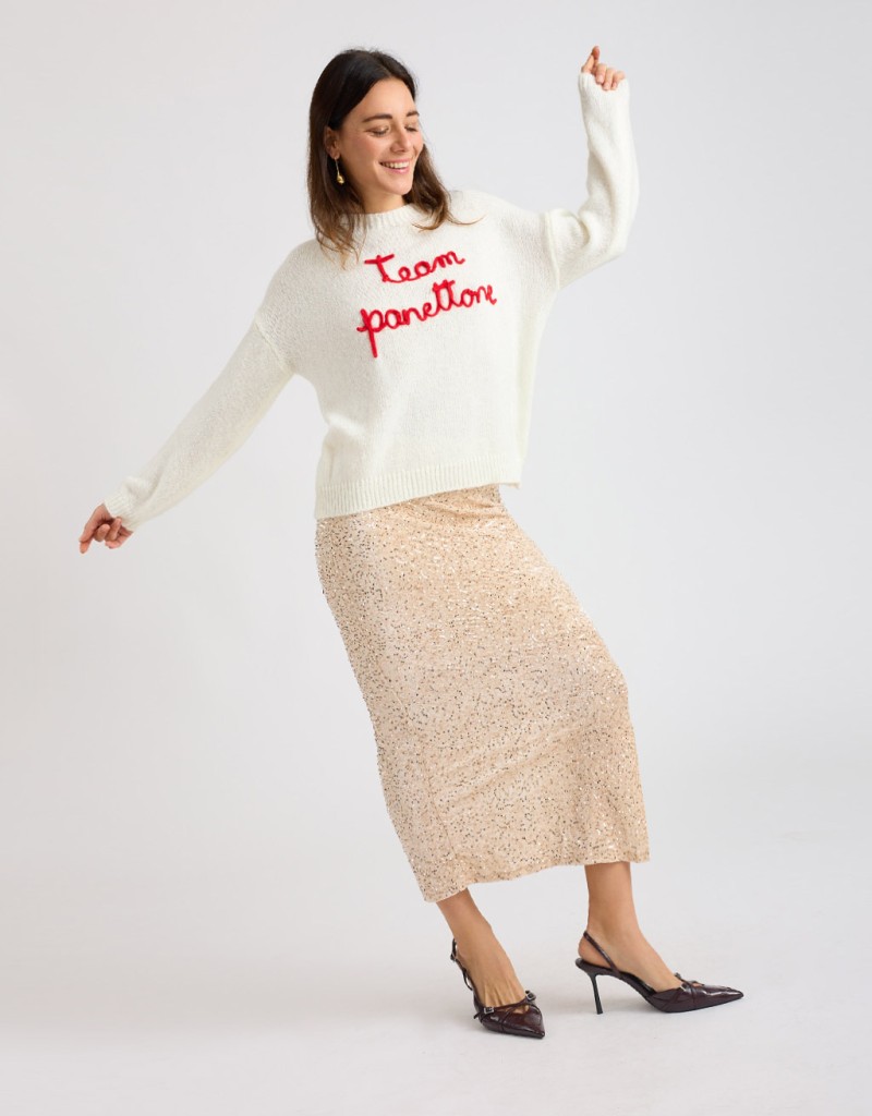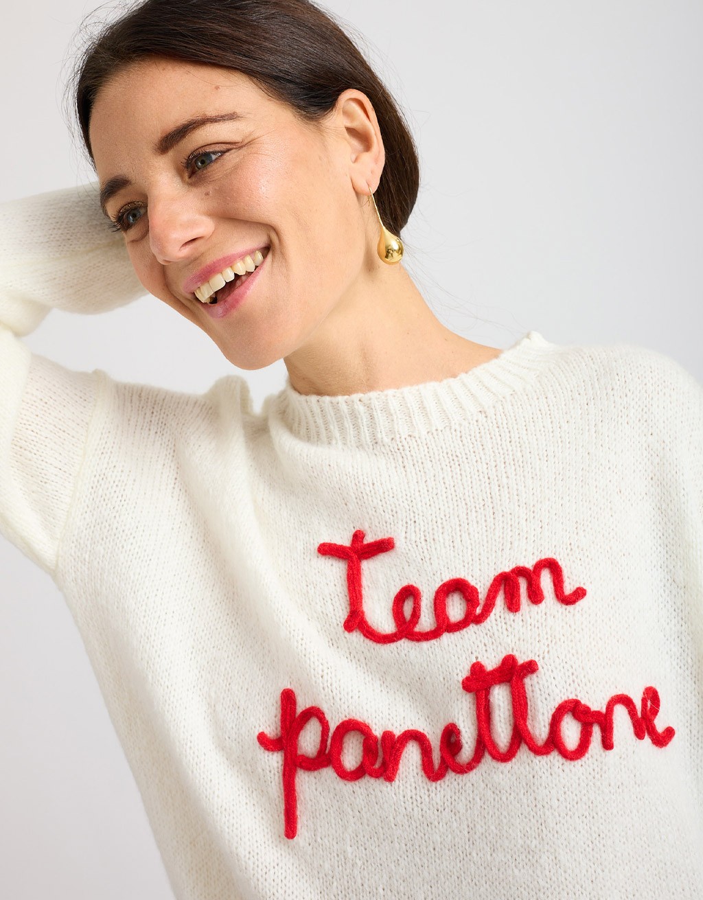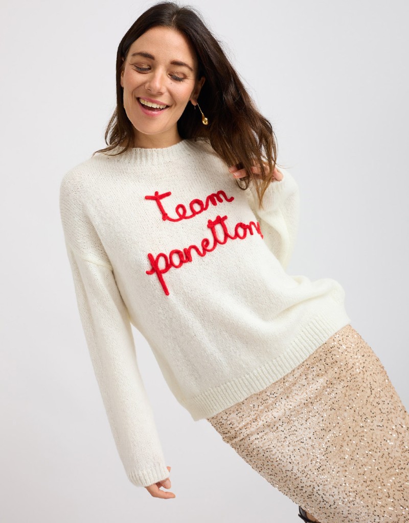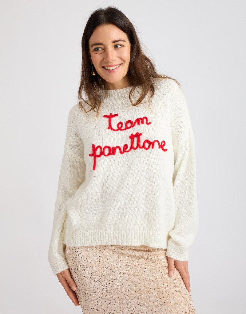 Maglione basico con scritta “Team Panettone” cucita sul davanti: natalizio al punto giusto, senza rinunciare alla morbidezza. Il tessuto caldo avvolge con comfort nelle giornate più fredde, mentre la vestibilità morbida lo rende perfetto per look rilassati ma curati, dal mattino alla sera.