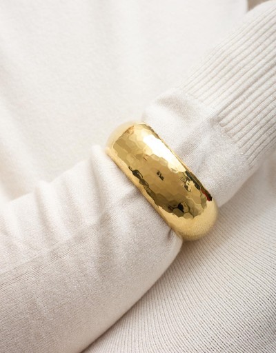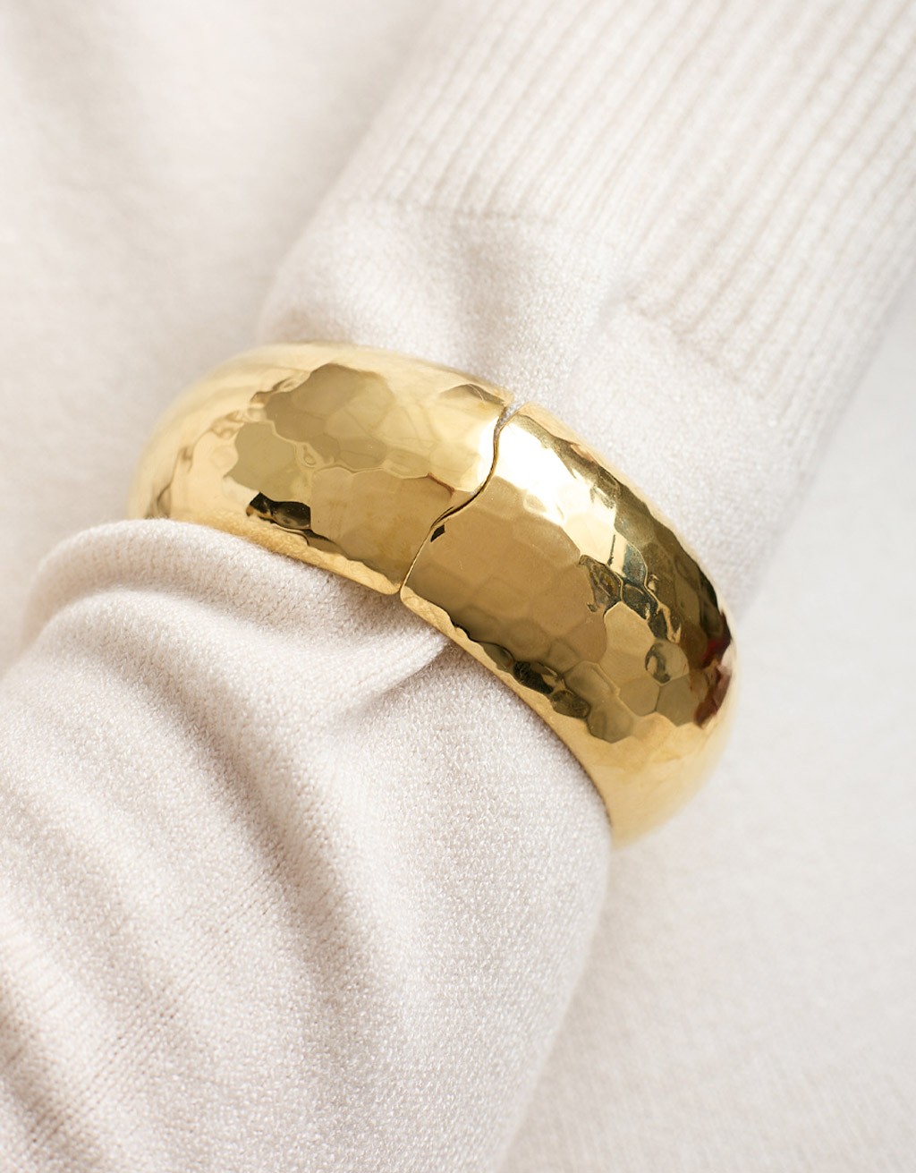 (Ogni 1,00 € speso = 1 punto)Bracciale rigido dotato di molla per una calzata comoda e adattabile. La superficie presenta un’elegante martellatura a motivi esagonali, che dona texture e luminosità al design. Un accessorio moderno e versatile, perfetto per aggiungere un tocco di carattere e raffinatezza a qualsiasi look.