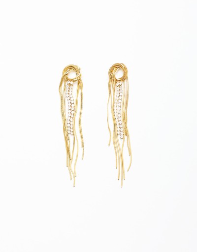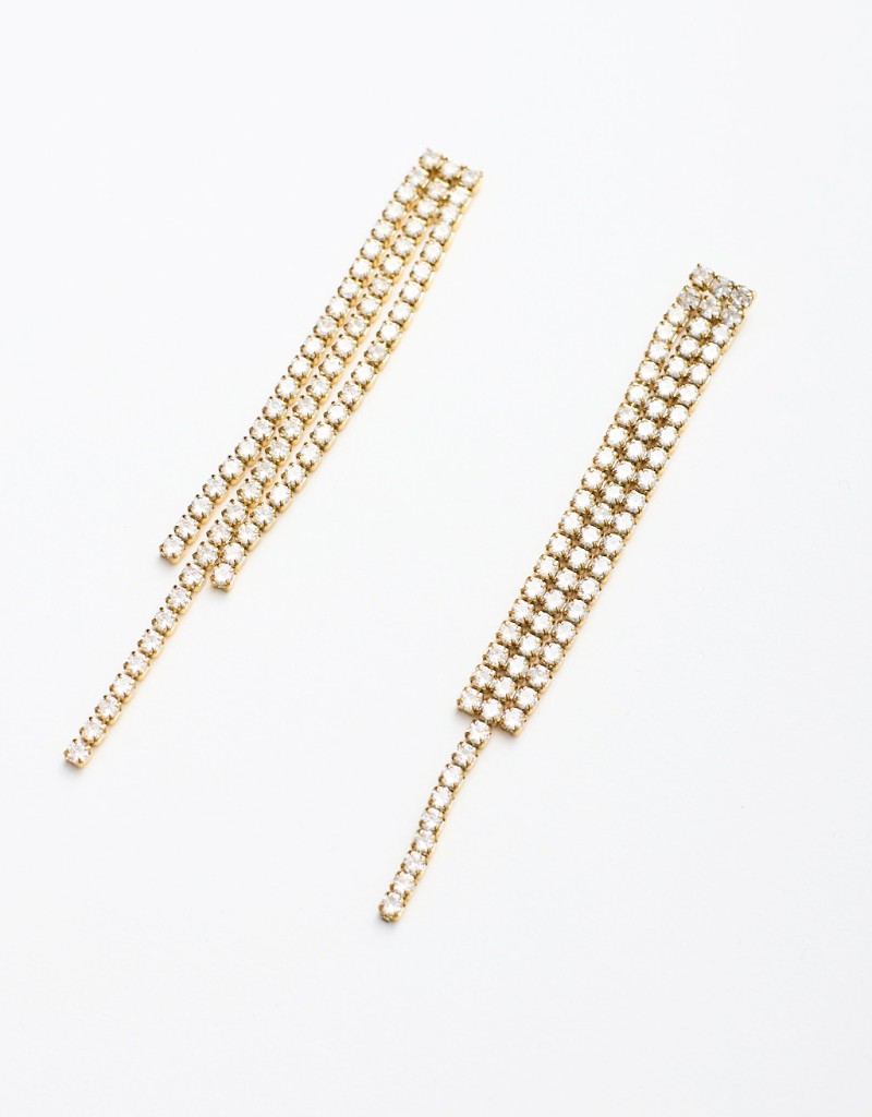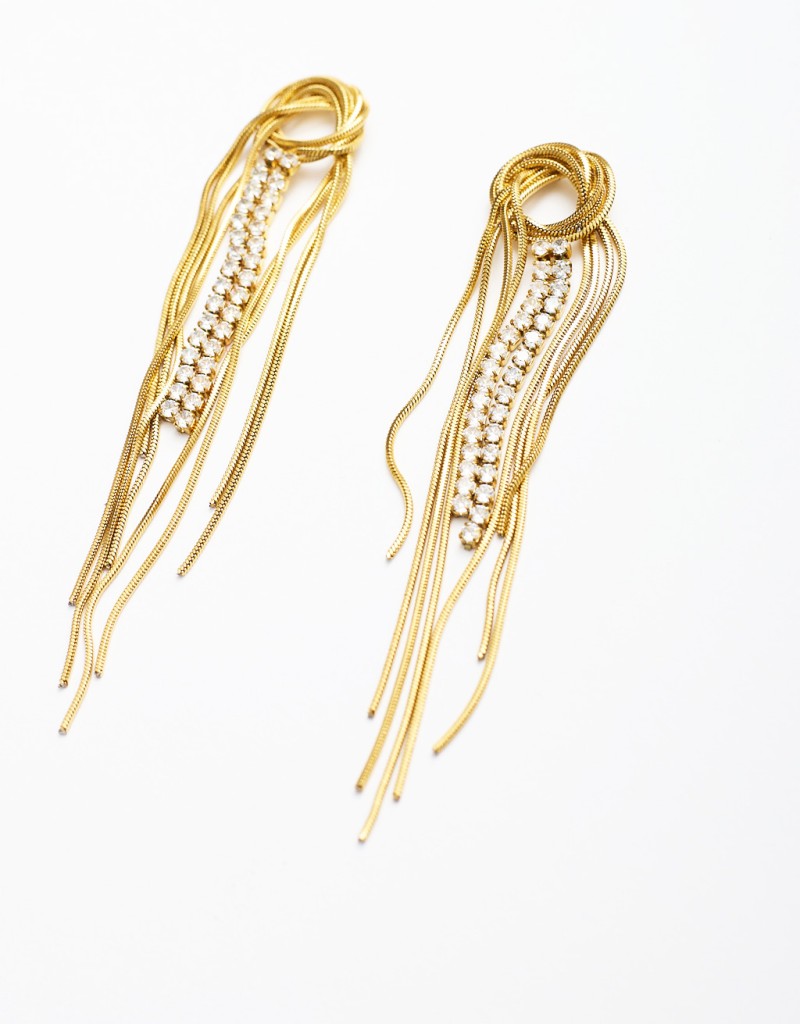 Orecchino in acciaio dal design raffinato, caratterizzato da un delicato nodo che dona movimento e stile. Da esso scendono due fili tennis pendenti, impreziositi da zirconi luminosi che catturano la luce a ogni passo. Un accessorio moderno e brillante, perfetto per aggiungere un tocco di eleganza contemporanea a qualsiasi look.