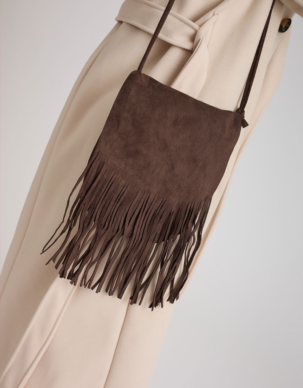 (Ogni 1,00 € speso = 1 punto)Tracolla dallo stile boho-chic, realizzata in materiale effetto camoscio morbido al tatto. Decorata con eleganti frange, aggiunge movimento e carattere al look, trasformando ogni outfit in un’insieme trendy e originale. Perfetta per chi ama uno stile versatile e di tendenza.