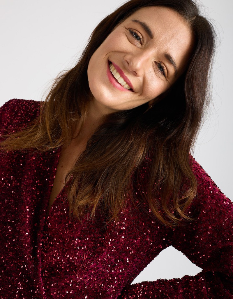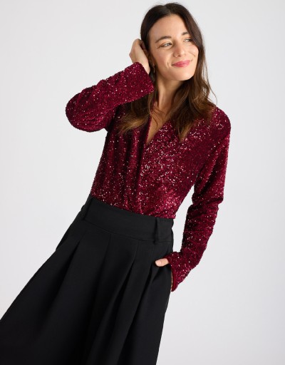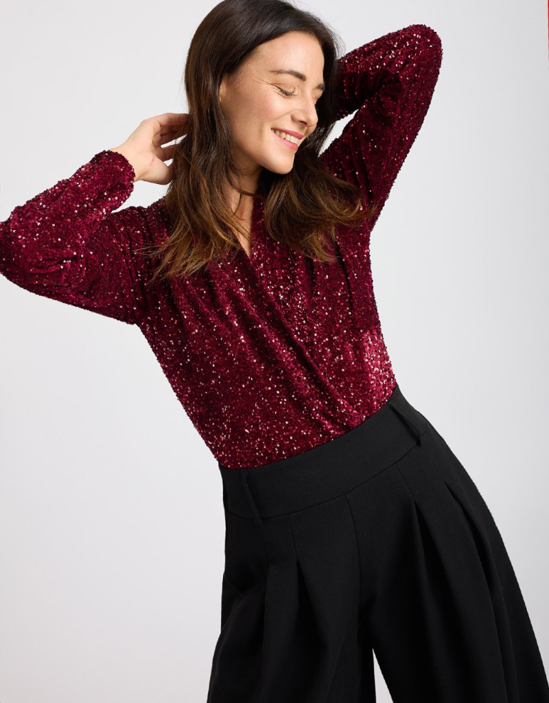 Un body super glam che unisce morbidezza e brillantezza in un solo colpo. Il tessuto floccato è caldo e piacevole sulla pelle, mentre le paillettes cucite aggiungono quel tocco luminoso perfetto per le serate più cool della stagione. La scollatura a scialle valorizza il décolleté con eleganza, restando sempre confortevole grazie alla fodera in viscosa interna.